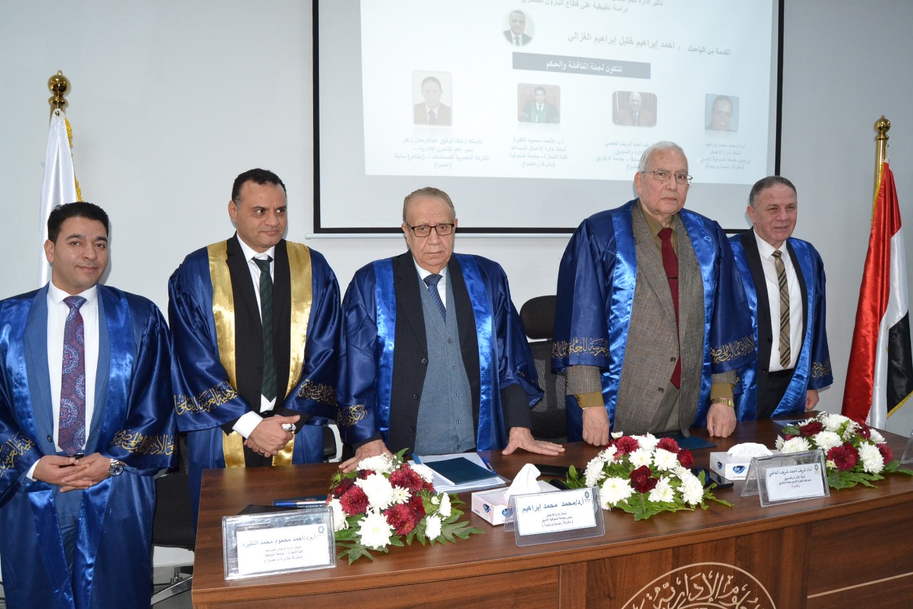 وتكونت لجنة المناقشة والإشراف من: أ.د/ محمد محمد إبراهيم، أستاذ إدارة الأعمال ورئيس جامعة المنوفية الأسبق، “مشرفًا رئيسيًا ورئيسًا”، وأ.د/ شريف أحمد شريف العاصي، أستاذ الإدارة والتسويق وعميد كلية التجارة سابقًا بجامعة الزقازيق، “عضوًا”، وأ.م.د/ أحمد محمود النقيرة، أستاذ إدارة الأعمال المساعد بكلية التجارة جامعة المنوفية، “مشرفًا وعضوًا”، والأستاذ/ خالد توفيق عبد الرحمن، مدير عام الشؤون الإدارية بالشركة المصرية للصمامات سابقًا (إيفاكو)، “عضوًا”.