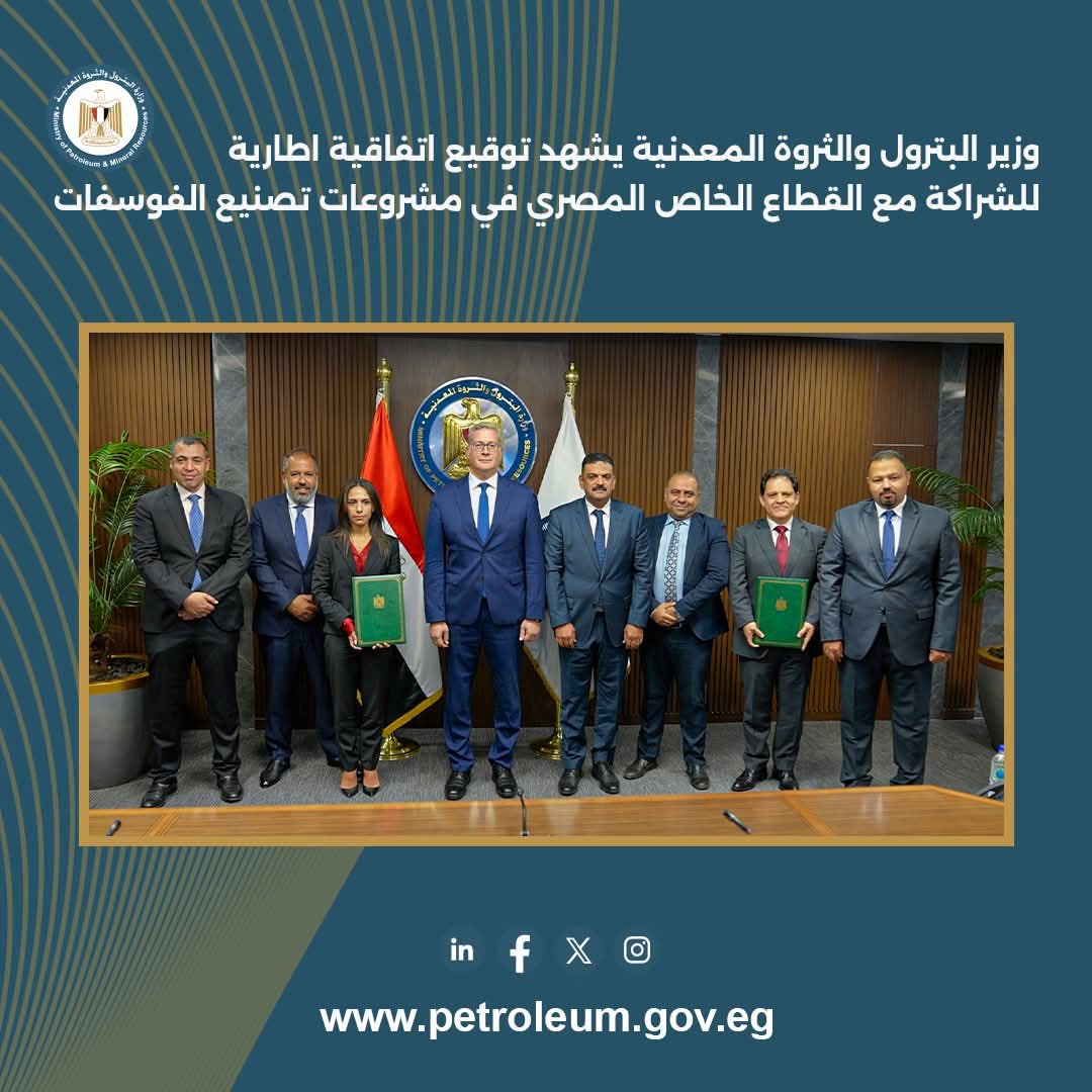 شهد المهندس كريم بدوي وزير البترول والثروة المعدنية، توقيع اتفاقية إطارية للشراكة في مشروعات تصنيع خام الفوسفات وتعظيم القيمة المضافة، وذلك بين الشركة المصرية للثروات التعدينية التابعة لهيئة الثروة المعدنية والصناعات التعدينية، وشركة “فيركيم مصر للأسمدة”، إحدى شركات مجموعة بولي سيرف للأسمدة.