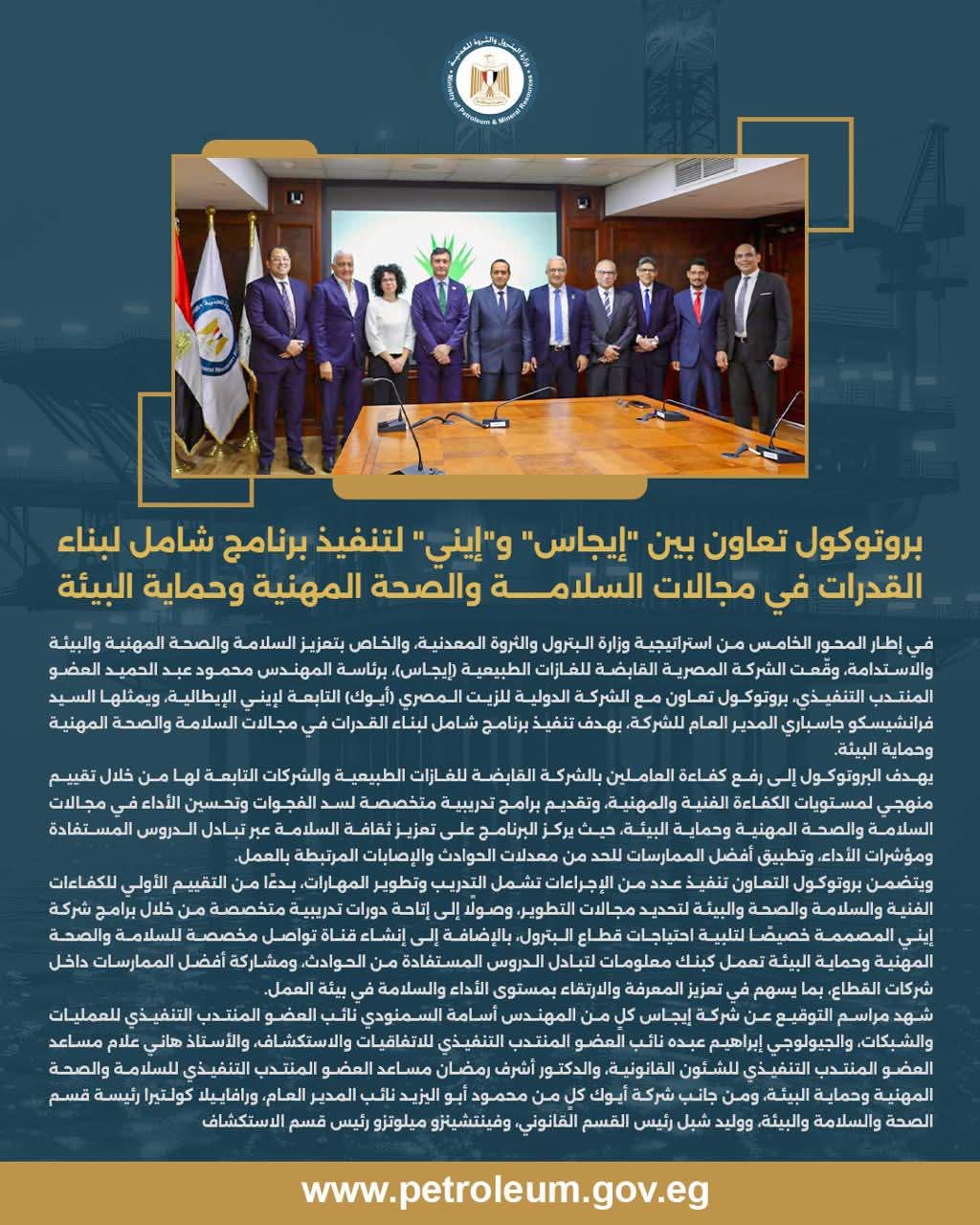 وقّعت الشركة المصرية القابضة للغازات الطبيعية (إيجاس)، برئاسة المهندس محمود عبد الحميد العضو المنتدب التنفيذي، بروتوكول تعاون مع الشركة الدولية للزيت المصري (أيوك) التابعة لشركة إيني الإيطالية، ويمثلها السيد فرانشيسكو جاسباري المدير العام للشركة، بهدف تنفيذ برنامج شامل لبناء القدرات في مجالات السلامة والصحة المهنية وحماية البيئة.