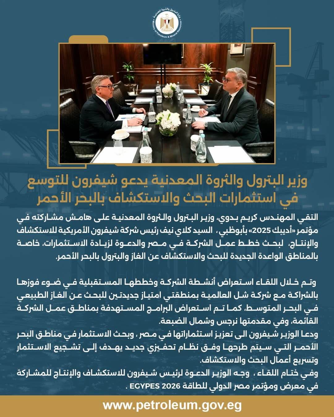 وفي ختام اللقاء، وجّه الوزير الدعوة إلى رئيس «شيفرون» للاستكشاف والإنتاج للمشاركة في معرض ومؤتمر مصر الدولي للطاقة «EGYPES 2026».