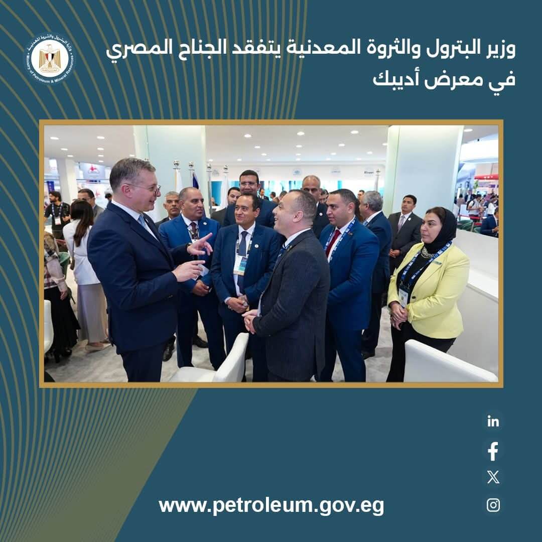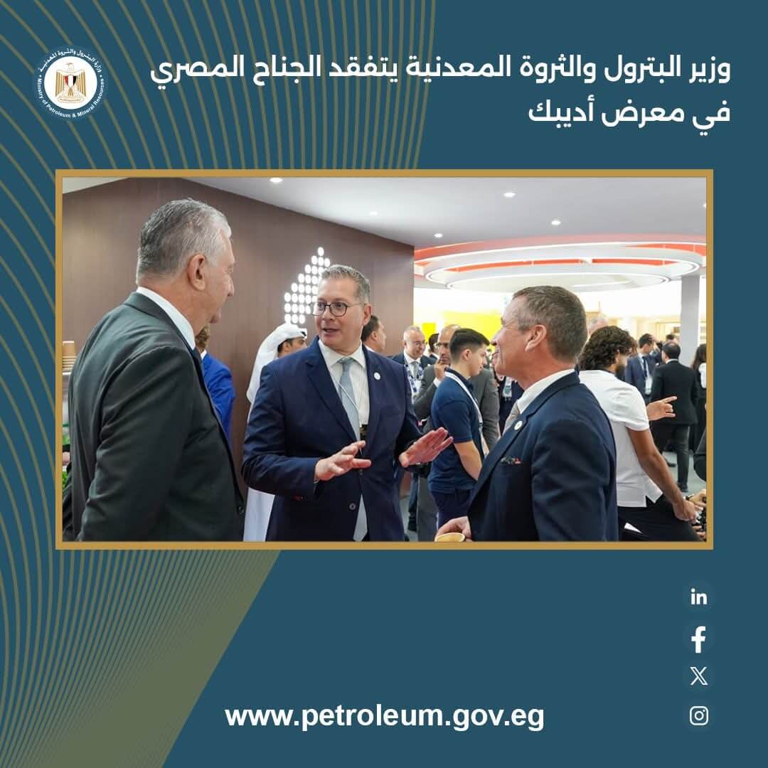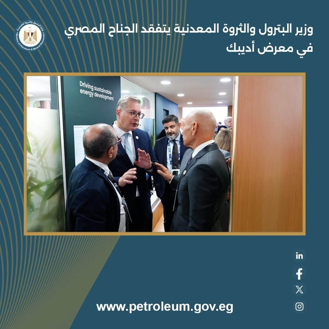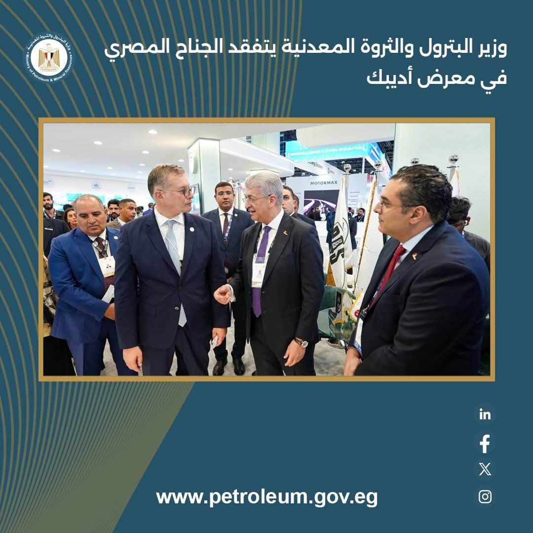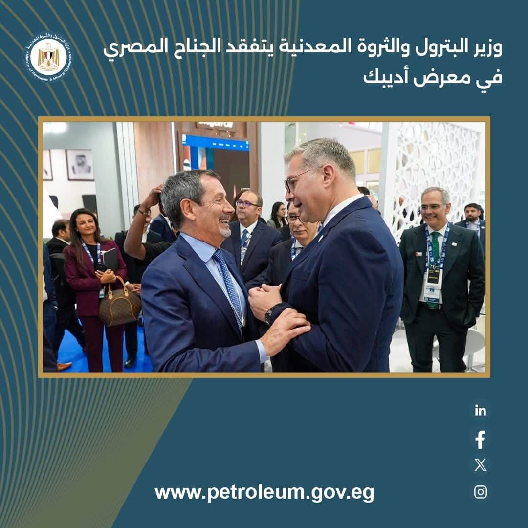 وخلال تفقده للجناح، أكد وزير البترول والثروة المعدنية أن مشاركة مصر في معرض ومؤتمر أديبك هذا العام لها خصوصية كبرى، نظرًا لتوجه الوزارة نحو تعزيز التواجد الفعال في المحافل العالمية المخصصة للطاقة، والترويج لفرص الاستثمار المتاحة في السوق المصرية أمام كبرى الشركات الدولية، مشيرًا إلى أن المعرض يُمثل منصة متميزة للتواصل المباشر مع شركاء النجاح في مختلف مجالات الصناعة البترولية، واستعراض ما تحقق من إنجازات في مجالات البحث والاستكشاف والإنتاج، وتطوير البنية التحتية، وتوسيع قاعدة الاستثمارات.