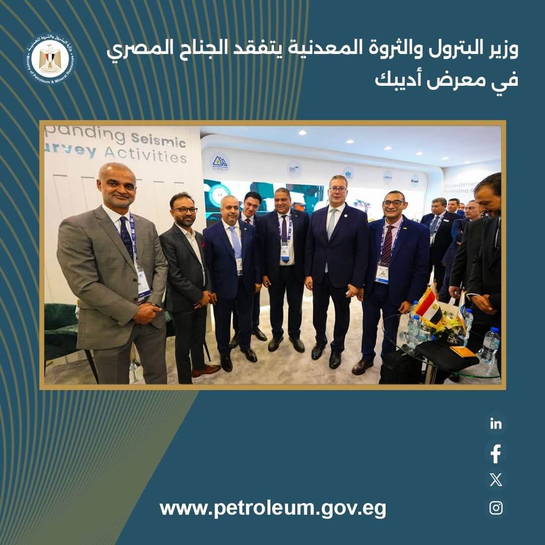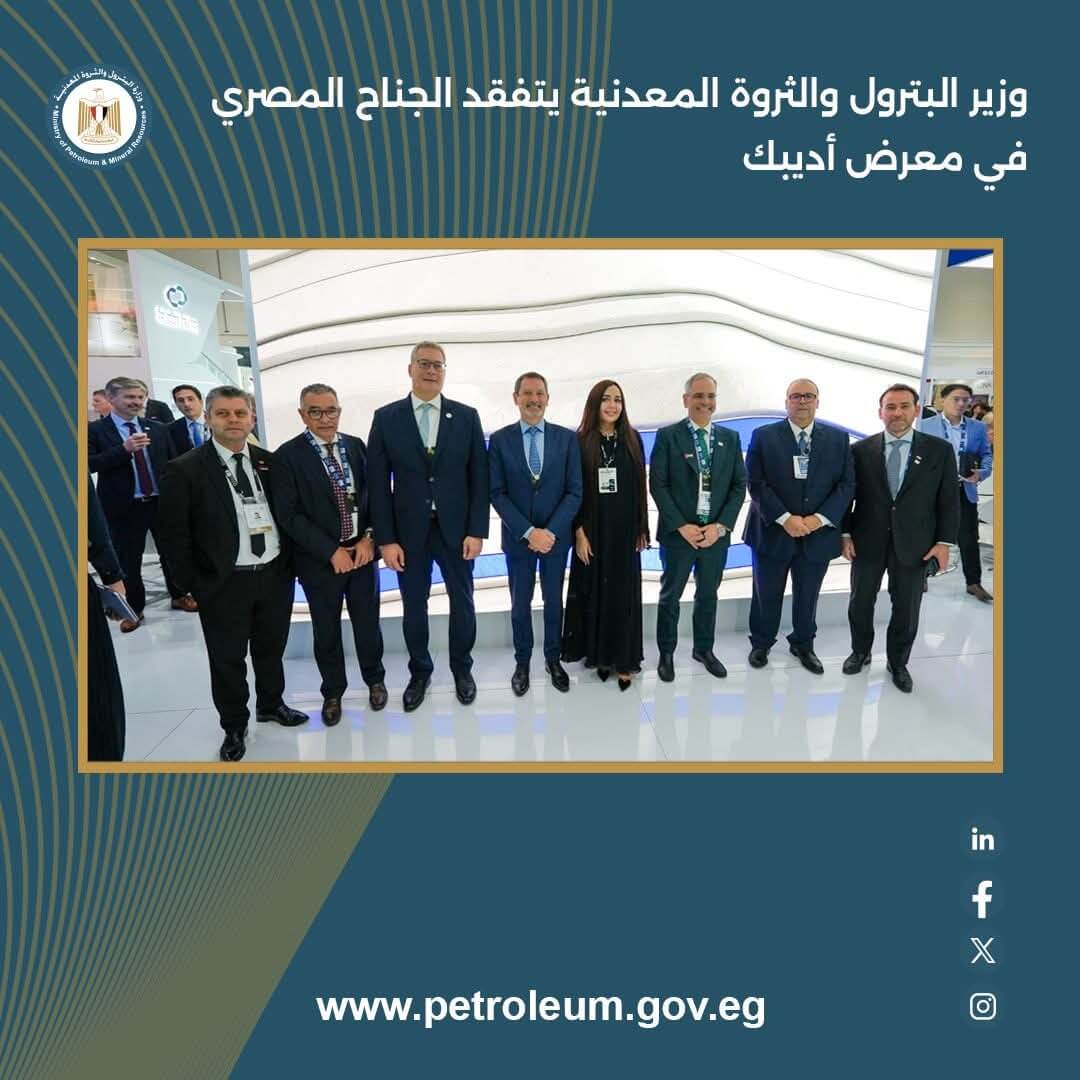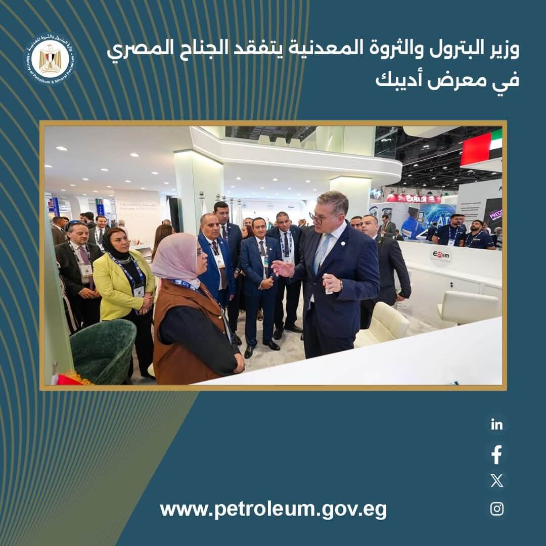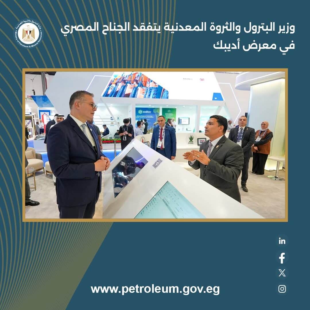 تفقد المهندس كريم بدوي، وزير البترول والثروة المعدنية، جناح الوزارة المُشارك في معرض ومؤتمر أبوظبي الدولي للبترول (ADIPEC)، وذلك خلال افتتاح المعرض بحضور الدكتور سلطان الجابر، وزير الصناعة والتكنولوجيا المتقدمة، وبمشاركة 2250 شركة عالمية متخصصة في مجالات البترول والغاز الطبيعي، والاستكشاف والتكرير، والطاقة المتجددة، والذكاء الاصطناعي، وتكنولوجيا المعلومات.
