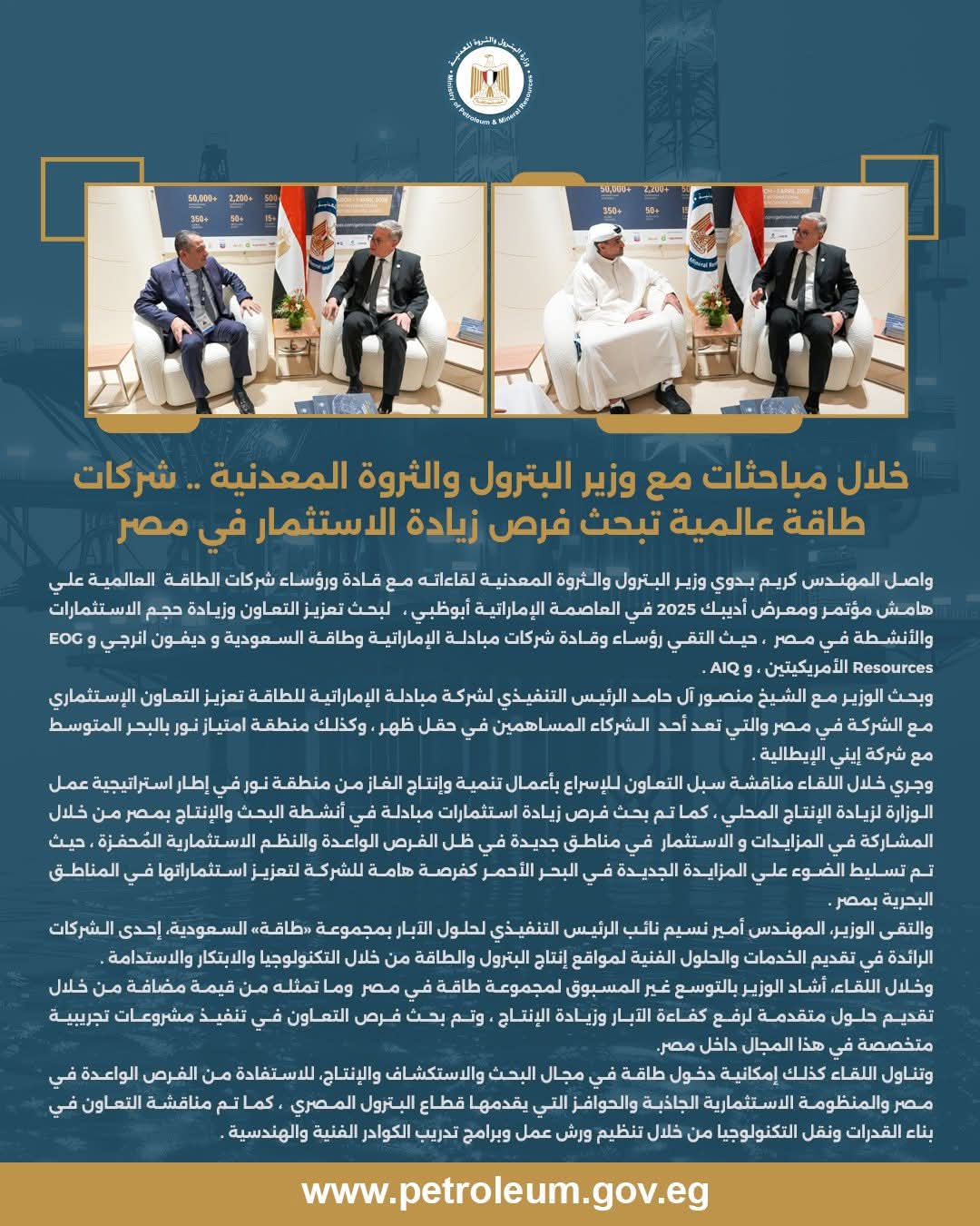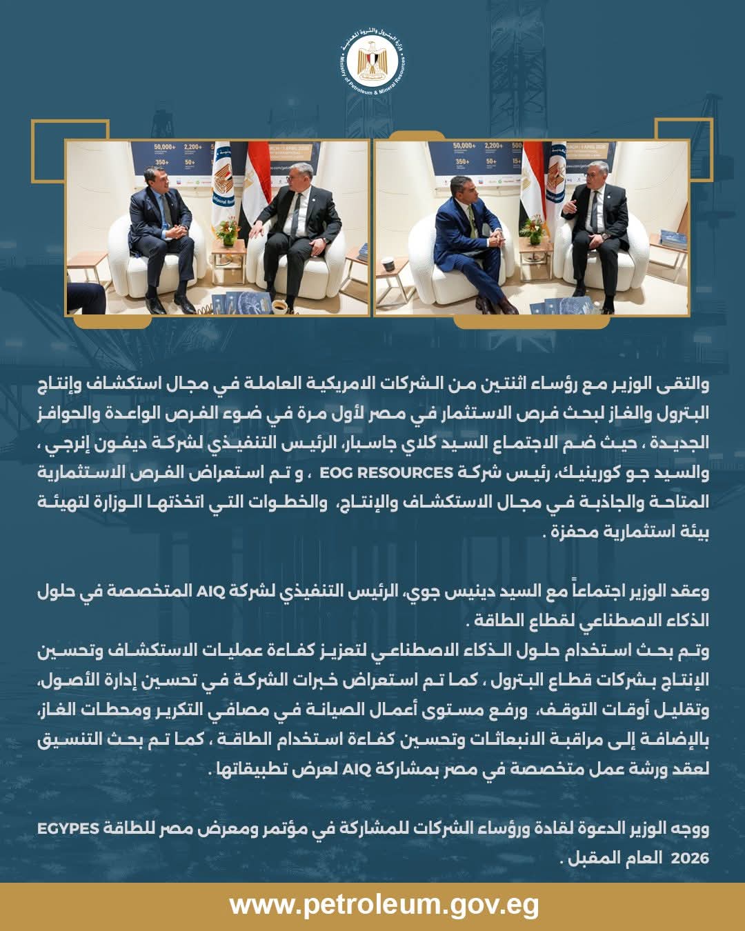 وفي ختام اللقاءات، وجه الوزير الدعوة لقادة ورؤساء الشركات للمشاركة في مؤتمر ومعرض مصر للطاقة (EGYPES 2026) العام المقبل بالقاهرة.