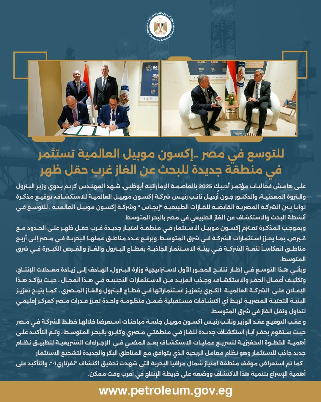على هامش فعاليات مؤتمر «أديبك 2025» بالعاصمة الإماراتية أبوظبي، شهد المهندس كريم بدوي، وزير البترول والثروة المعدنية، والدكتور جون أُرديل، نائب رئيس شركة إكسون موبيل العالمية للاستكشاف، توقيع مذكرة نوايا بين الشركة المصرية القابضة للغازات الطبيعية «إيجاس» وشركة إكسون موبيل العالمية، للتوسع في أنشطة البحث والاستكشاف عن الغاز الطبيعي في مصر بالبحر المتوسط.