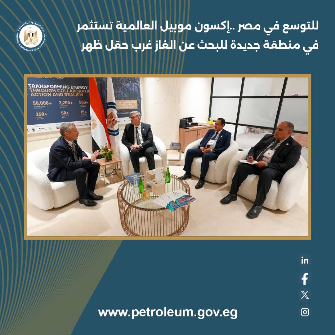 وعقب التوقيع، عقد الوزير ونائب رئيس إكسون موبيل جلسة مباحثات استعرضا خلالها خطط الشركة في مصر، حيث ستقوم بحفر آبار استكشافية جديدة للغاز في منطقتي «مصري» و«كايرو» بالبحر المتوسط.