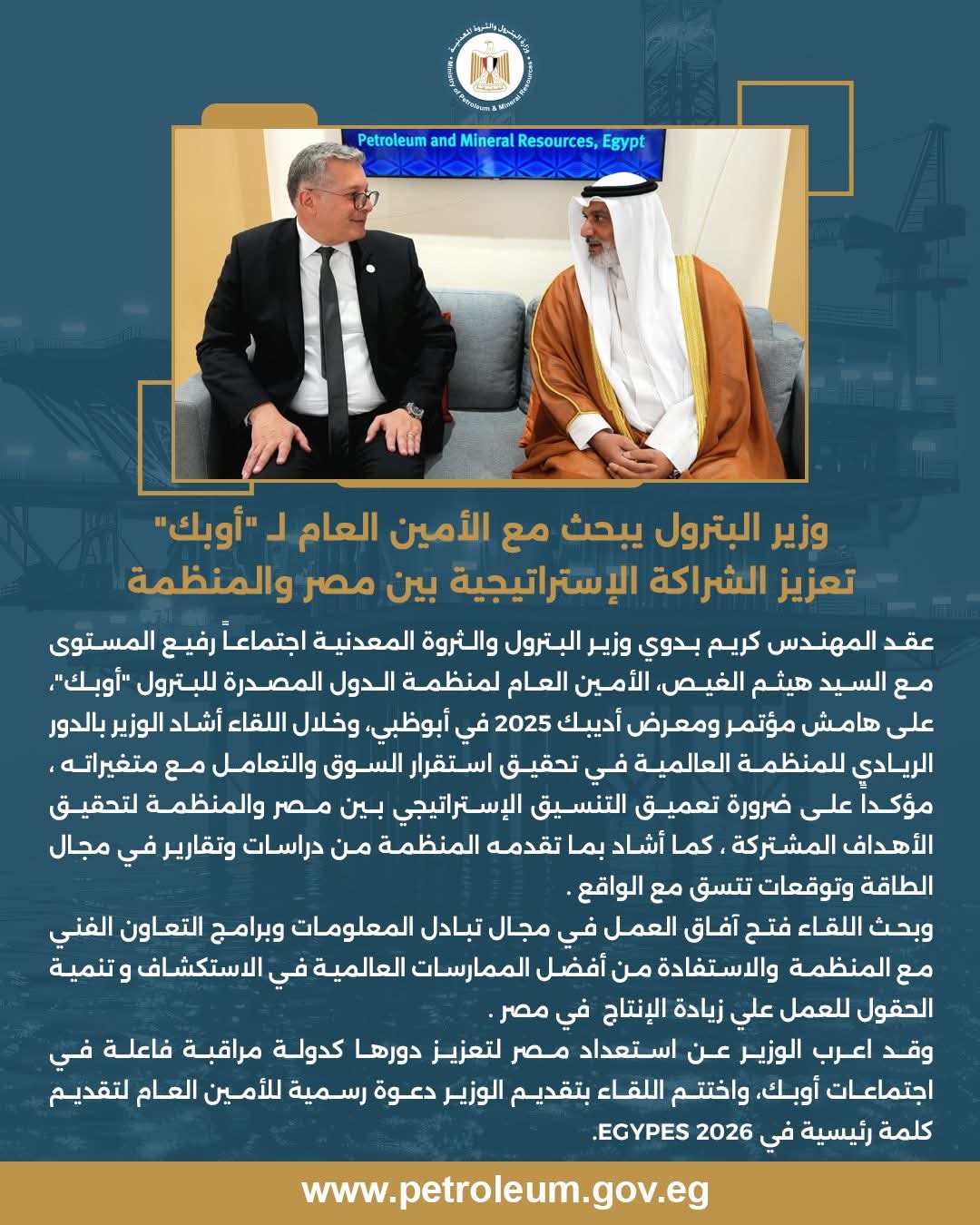 وخلال اللقاء، أشاد الوزير بالدور الريادي الذي تقوم به المنظمة في تحقيق استقرار أسواق الطاقة والتعامل مع متغيراتها، مؤكداً أهمية تعميق التنسيق الإستراتيجي بين مصر والمنظمة لتحقيق الأهداف المشتركة، كما أثنى على ما تقدمه المنظمة من دراسات وتقارير دقيقة في مجال الطاقة، بما يعكس واقع السوق العالمي وتحدياته.