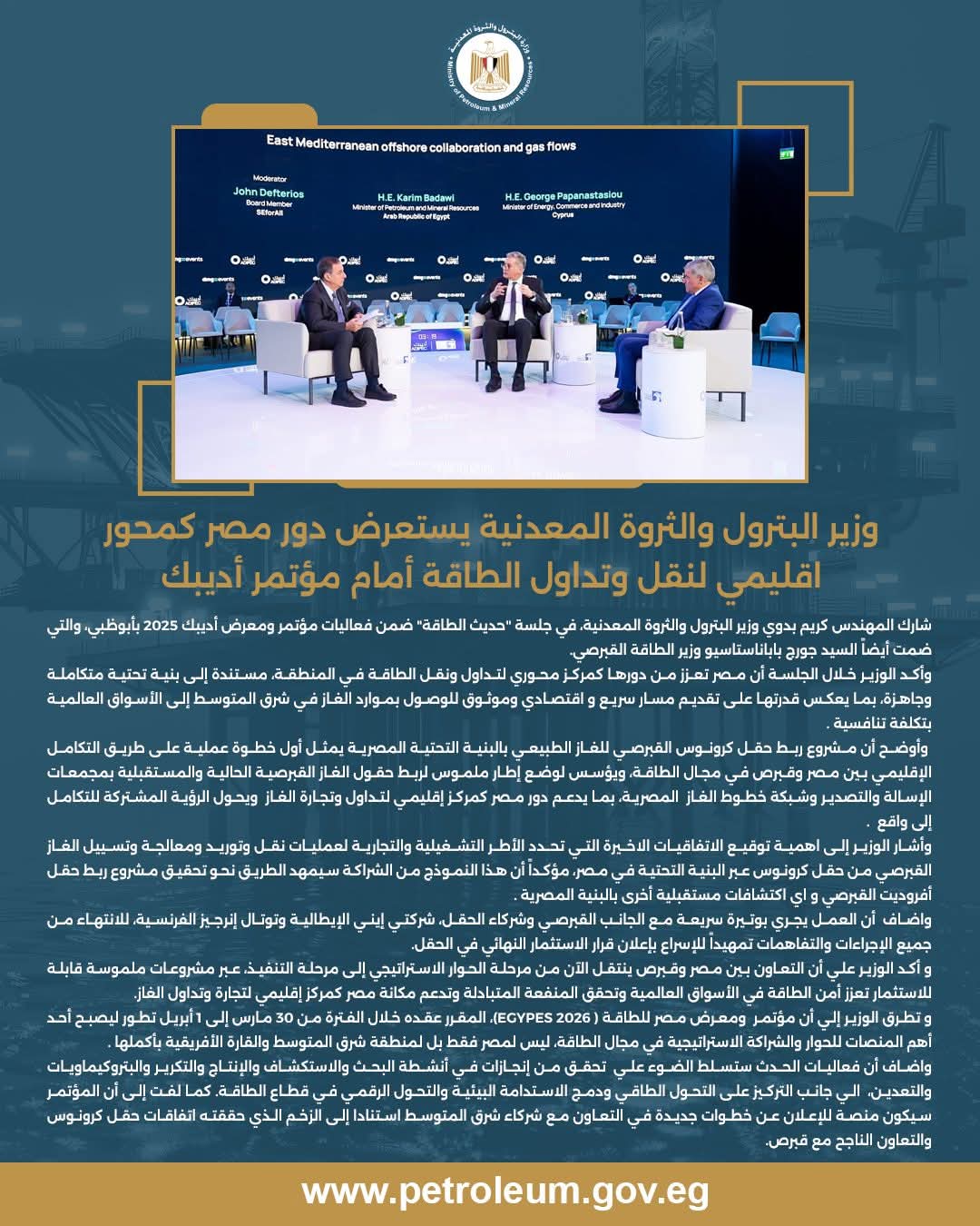 • مصدر الخبر: الصفحة الرسمية لوزارة البترول و الثروة المعدنية
