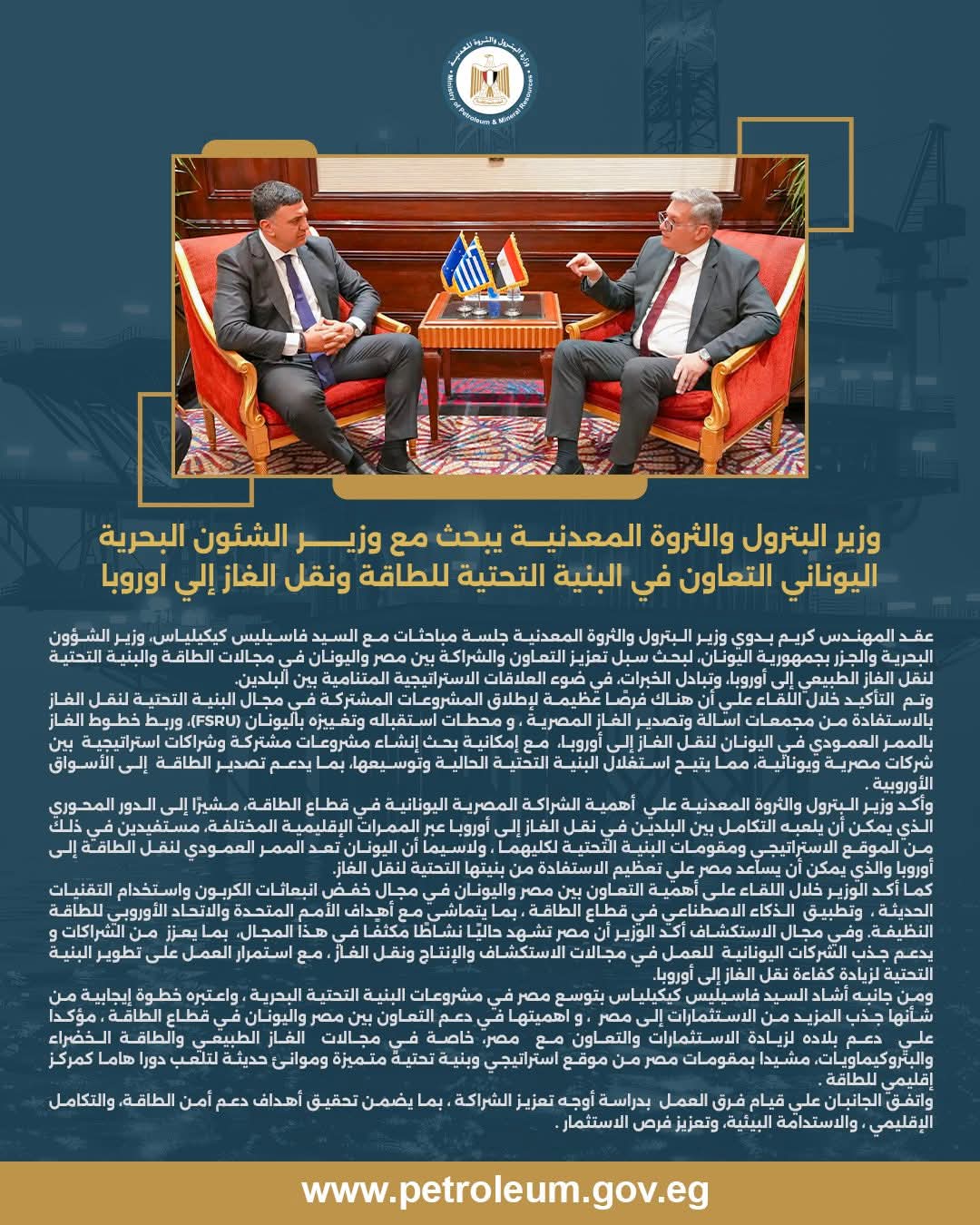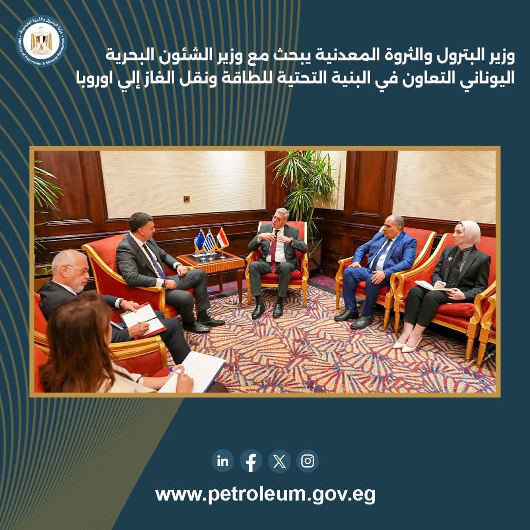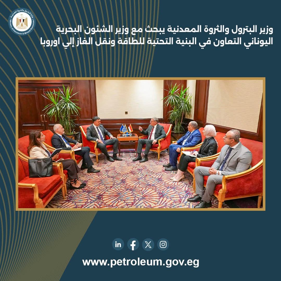 وزير البترول يبحث مع وزير الشؤون البحرية اليوناني تعزيز التعاون في مجالات الطاقة ونقل الغاز إلى أوروبا