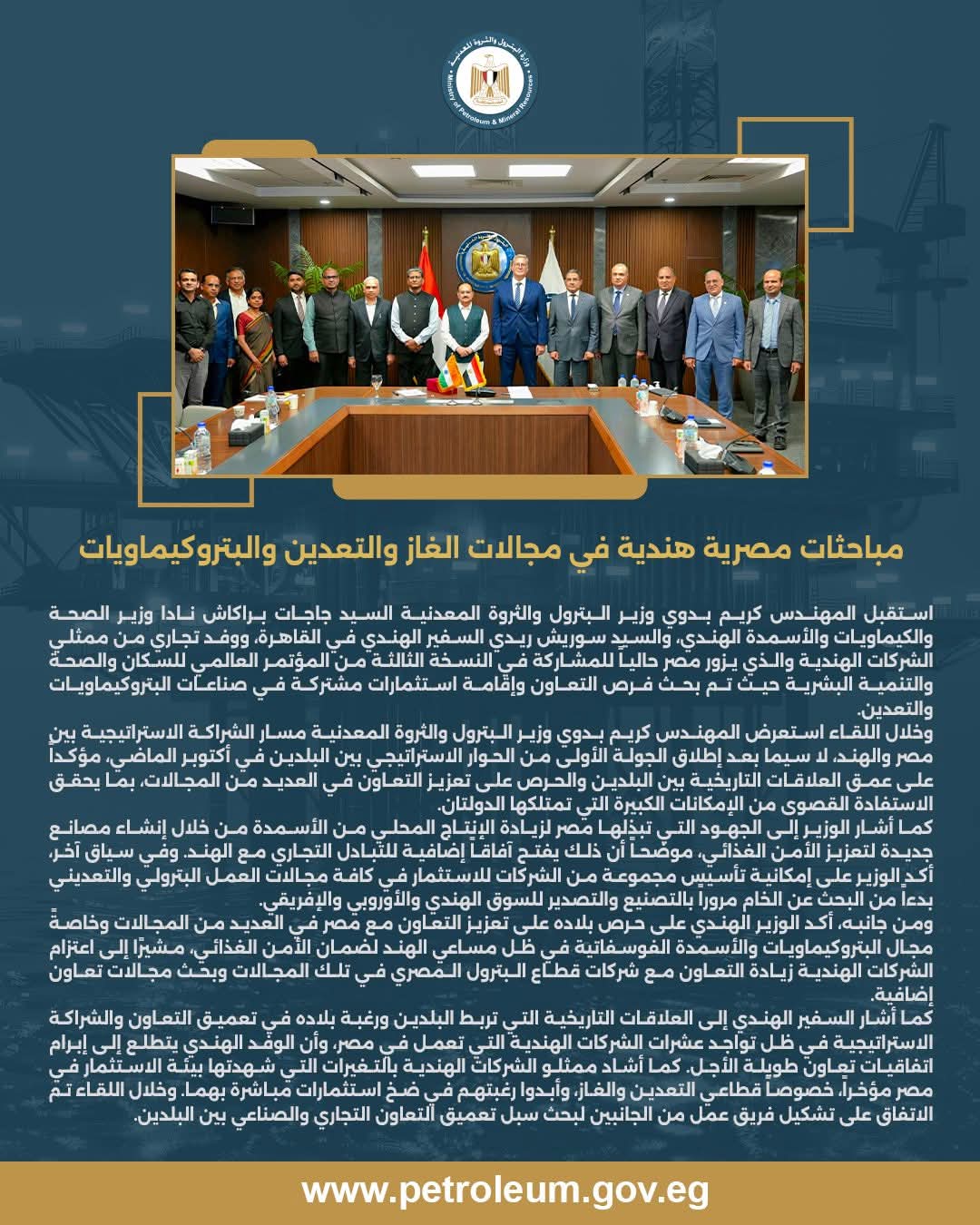 استقبل المهندس كريم بدوي وزير البترول والثروة المعدنية، السيد جاجات براكاش نادا وزير الصحة والكيماويات والأسمدة الهندي، والسيد سوريش ريدي السفير الهندي في القاهرة، ووفدًا تجاريًا من ممثلي الشركات الهندية، والذي يزور مصر حاليًا للمشاركة في النسخة الثالثة من المؤتمر العالمي للسكان والصحة والتنمية البشرية، حيث تم بحث فرص التعاون وإقامة استثمارات مشتركة في صناعات البتروكيماويات والتعدين.