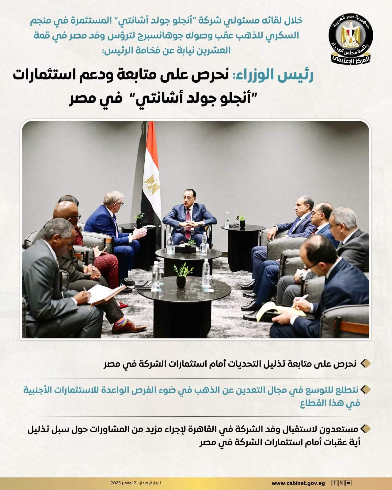 وخلال اللقاء، أعرب رئيس الوزراء عن تقديره للشراكة الإستراتيجية مع شركة “أنجلو جولد أشانتي” المُشغلة لمنجم السكري للذهب، مؤكداً حرصه على متابعة ودعم استثمارات الشركة في مصر. كما أشار إلى زيارته السابقة للمنجم وتطلعه للاطلاع على تطورات العمل الجارية.