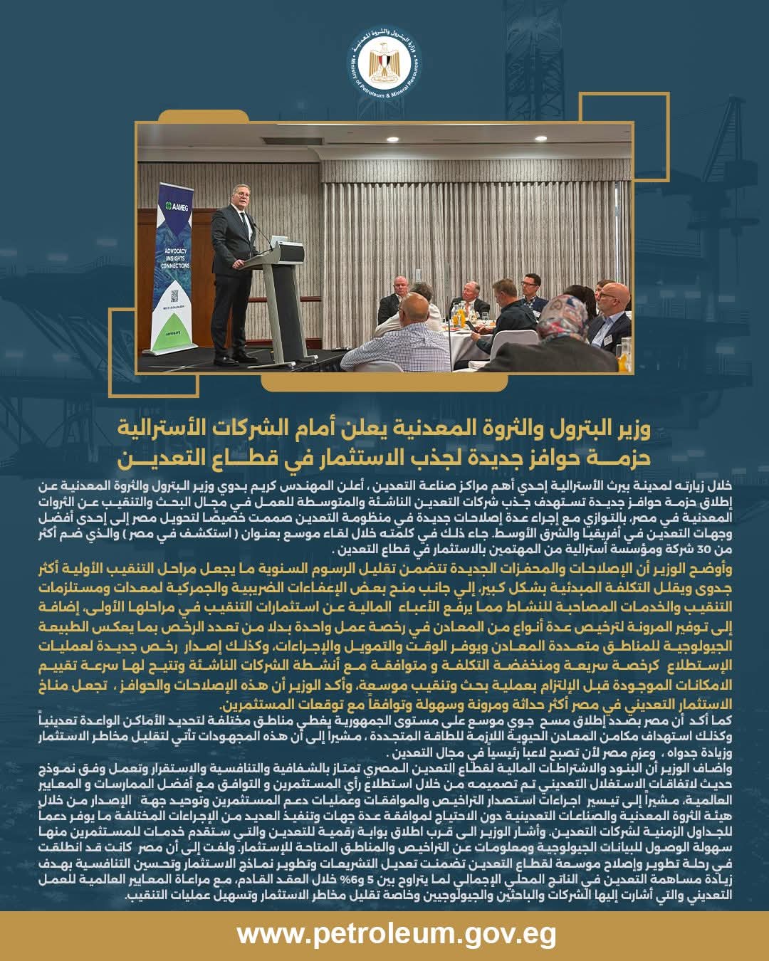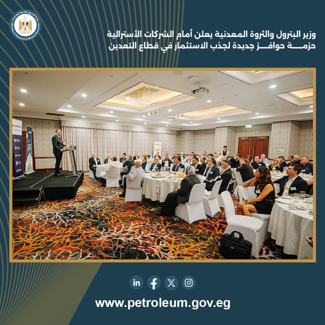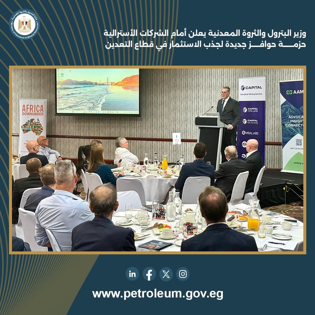 جاء ذلك خلال كلمته في لقاء موسّع بعنوان “استكشف في مصر”، والذي ضم أكثر من 30 شركة ومؤسسة أسترالية مهتمة بالاستثمار في قطاع التعدين.