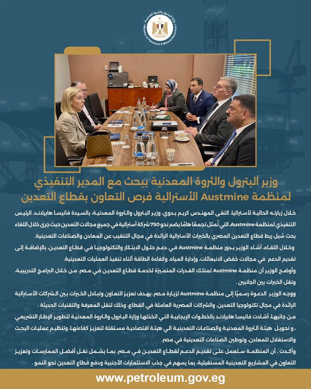 خلال زيارته الحالية لأستراليا، التقى المهندس كريم بدوي، وزير البترول والثروة المعدنية، بالسيدة فانيسا هابرلاند، الرئيس التنفيذي لمنظمة Austmine، التي تُمثّل تجمعًا مهمًا يضم نحو 750 شركة أسترالية تعمل في مختلف مجالات التعدين.