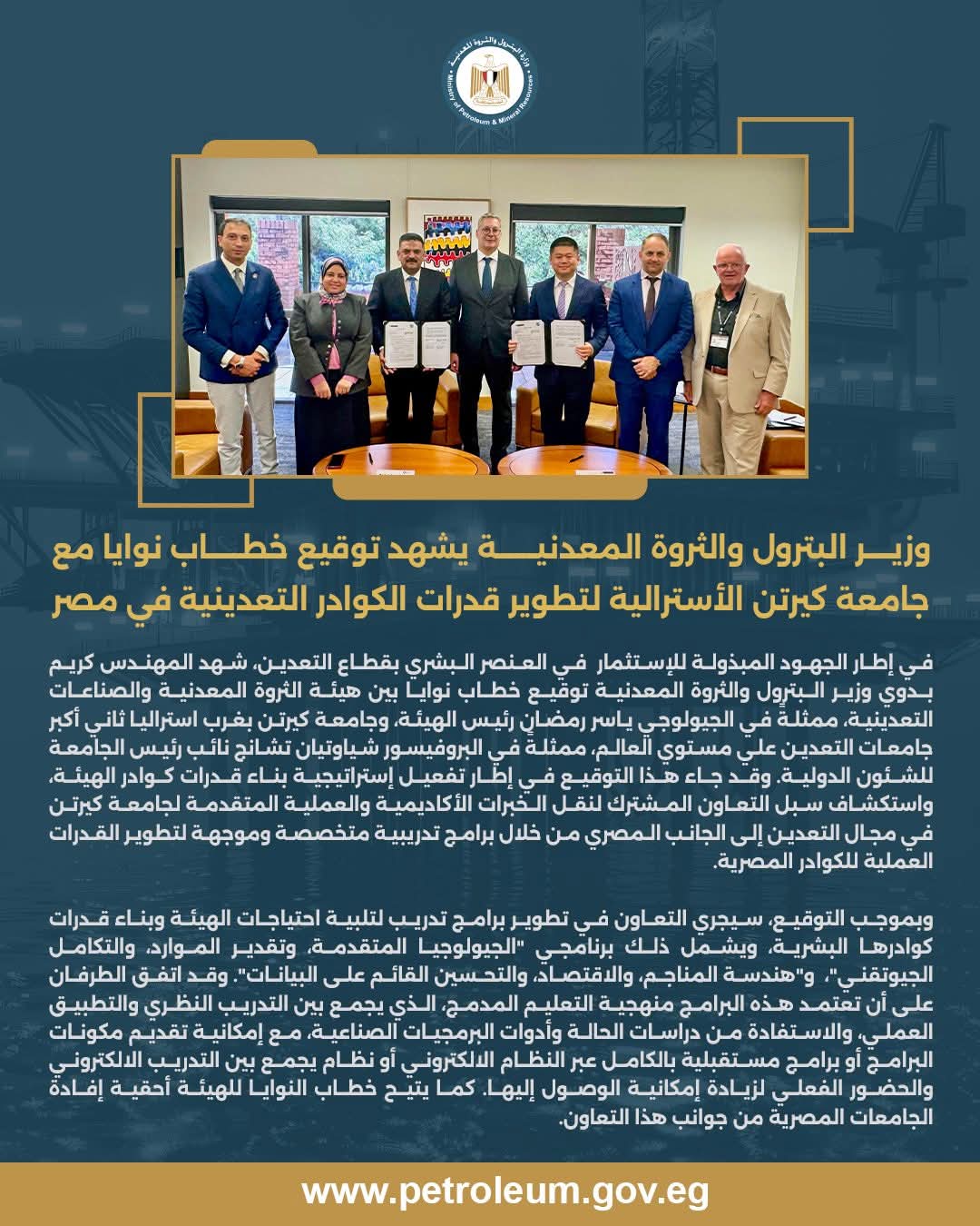 في ضوء الجهود المبذولة للاستثمار في العنصر البشري بـ قطاع التعدين، شهد المهندس كريم بدوي، وزير البترول والثروة المعدنية، توقيع خطاب نوايا بين هيئة الثروة المعدنية والصناعات التعدينية، ممثَّلة في الجيولوجي ياسر رمضان، رئيس الهيئة، وجامعة كيرتن بغرب أستراليا، ثاني أكبر جامعات التعدين على مستوى العالم، ممثَّلة في البروفيسور شياوتيان تشانج، نائب رئيس الجامعة للشئون الدولية.