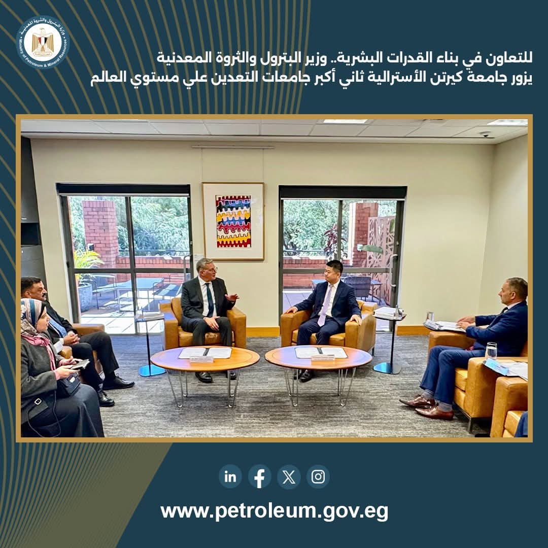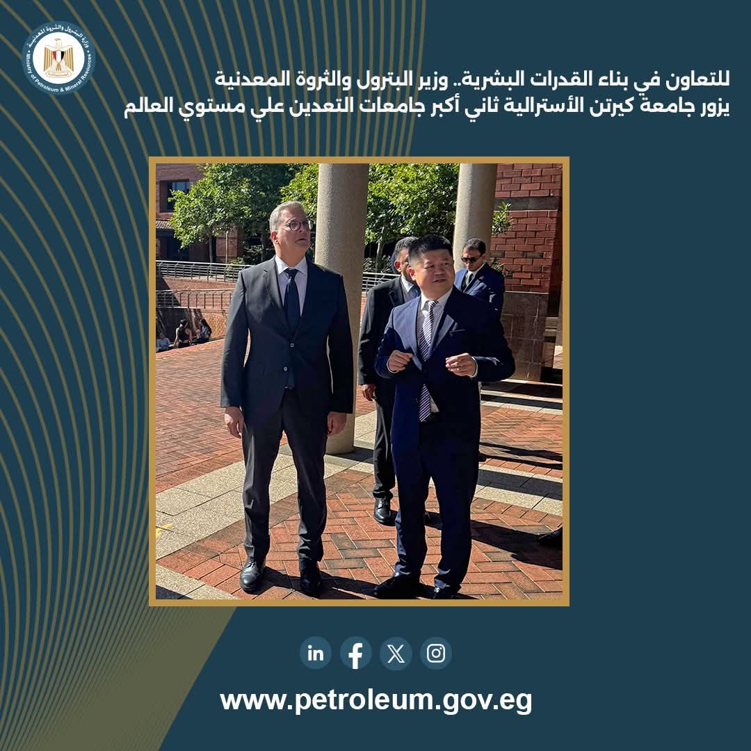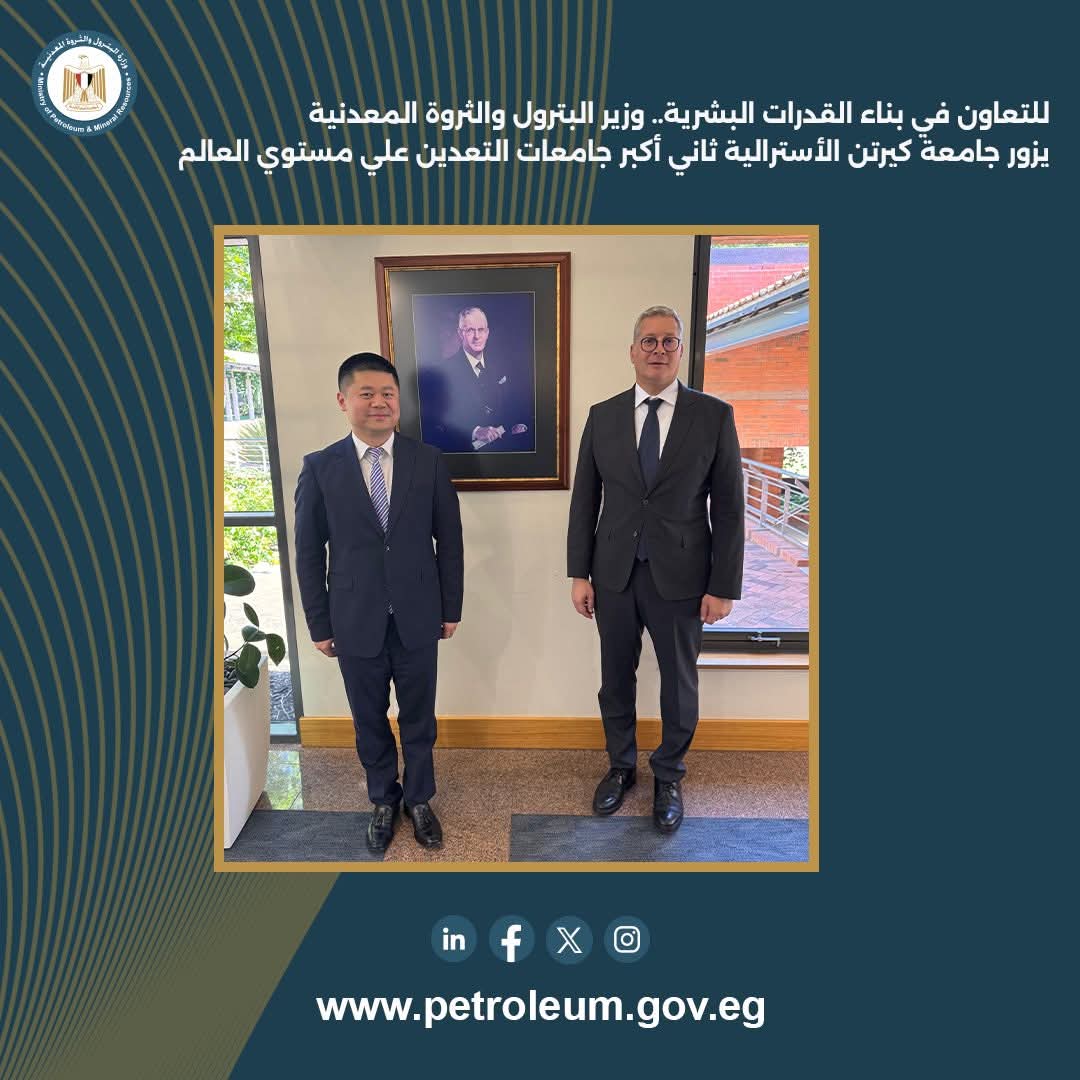 في ضوء الجهود المبذولة للاستثمار في العنصر البشري بـ قطاع التعدين، شهد المهندس كريم بدوي، وزير البترول والثروة المعدنية، توقيع خطاب نوايا بين هيئة الثروة المعدنية والصناعات التعدينية، ممثَّلة في الجيولوجي ياسر رمضان، رئيس الهيئة، وجامعة كيرتن بغرب أستراليا، ثاني أكبر جامعات التعدين على مستوى العالم، ممثَّلة في البروفيسور شياوتيان تشانج، نائب رئيس الجامعة للشئون الدولية.