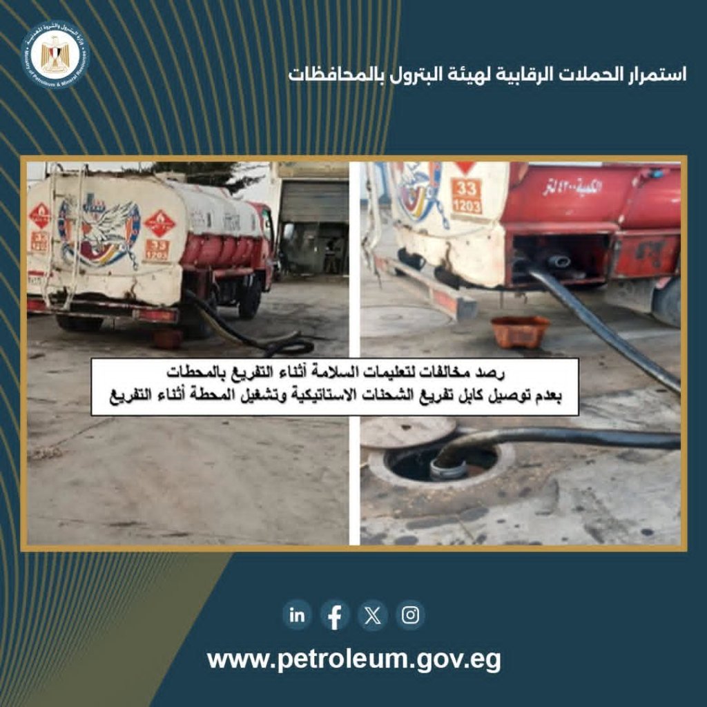 واصلت الهيئة العامة للبترول حملاتها التفتيشية المستمرة بكافة المحافظات و ذلك لمواجهة أي محاولات للتلاعب أو تداول في المنتجات بترولية مجهولة المصدر، وذلك في إطار الدور الرقابي للهيئة، وضمن جهود اللجنة المركزية للرقابة على نقل وتداول المنتجات البترولية خلال الأسبوع الأخيرة من نوفمبر 2025.