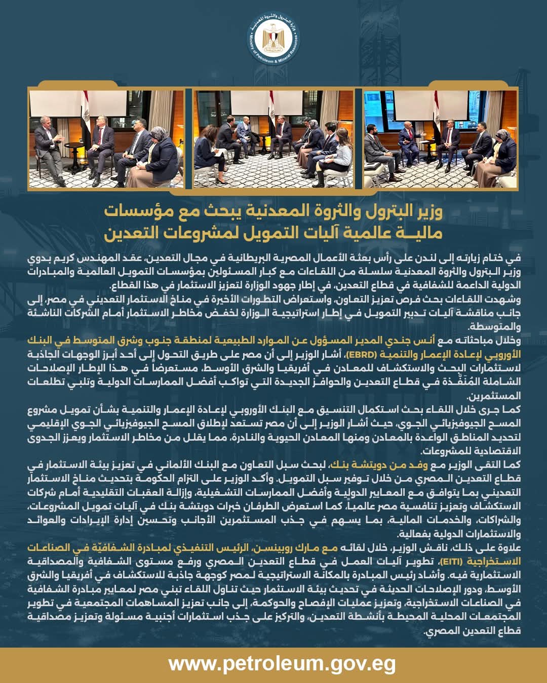 في ختام زيارته إلى لندن على رأس بعثة الأعمال المصرية البريطانية في مجال التعدين، عقد المهندس كريم بدوي وزير البترول والثروة المعدنية سلسلة من اللقاءات مع كبار المسئولين بمؤسسات التمويل العالمية والمبادرات الدولية الداعمة للشفافية في قطاع التعدين ، في إطار جهود الوزارة لتعزيز الاستثمار في هذا القطاع.