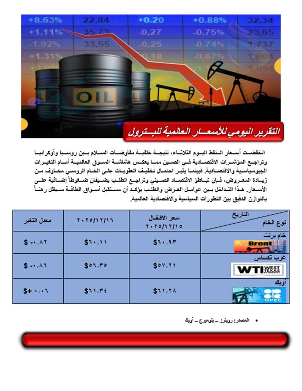 وانخفضت أسعار البترول اليوم الثلاثاء، نتيجة خلفية مفاوضات السلام بين روسيا و أوكرانيا وتراجع المؤشرات الاقتصادية في الصين مما يعكس هشاشة السوق العالمية أمام التغيرات الجيوسياسية والاقتصادية.