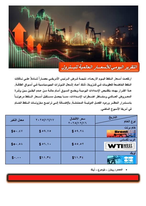 وارتفعت أسعار البترول اليوم الأربعاء، نتيجة فرض الرئيس الأمريكي حصارا” شاملا” على ناقلات النفط الخاضعة للعقوبات في فنزويلا، ذلك أعاد إشعال التوترات الجيوسياسية في أسواق الطاقة.