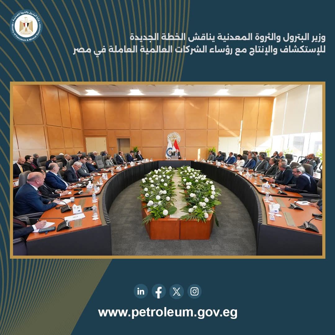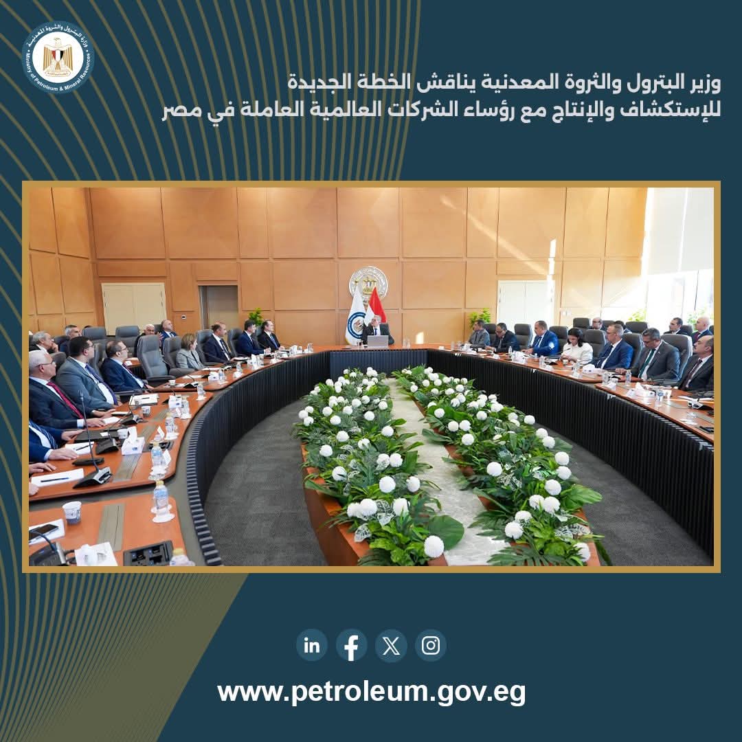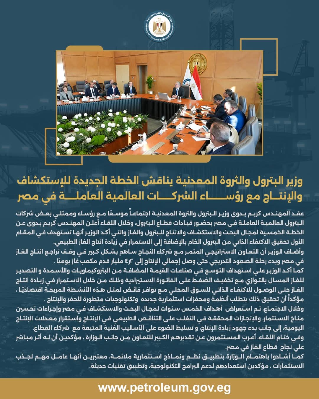 عقد المهندس كريم بدوي، وزير البترول والثروة المعدنية، اجتماعًا موسعًا مع رؤساء وممثلي بعض شركات البترول العالمية العاملة في مصر، بحضور قيادات قطاع البترول.