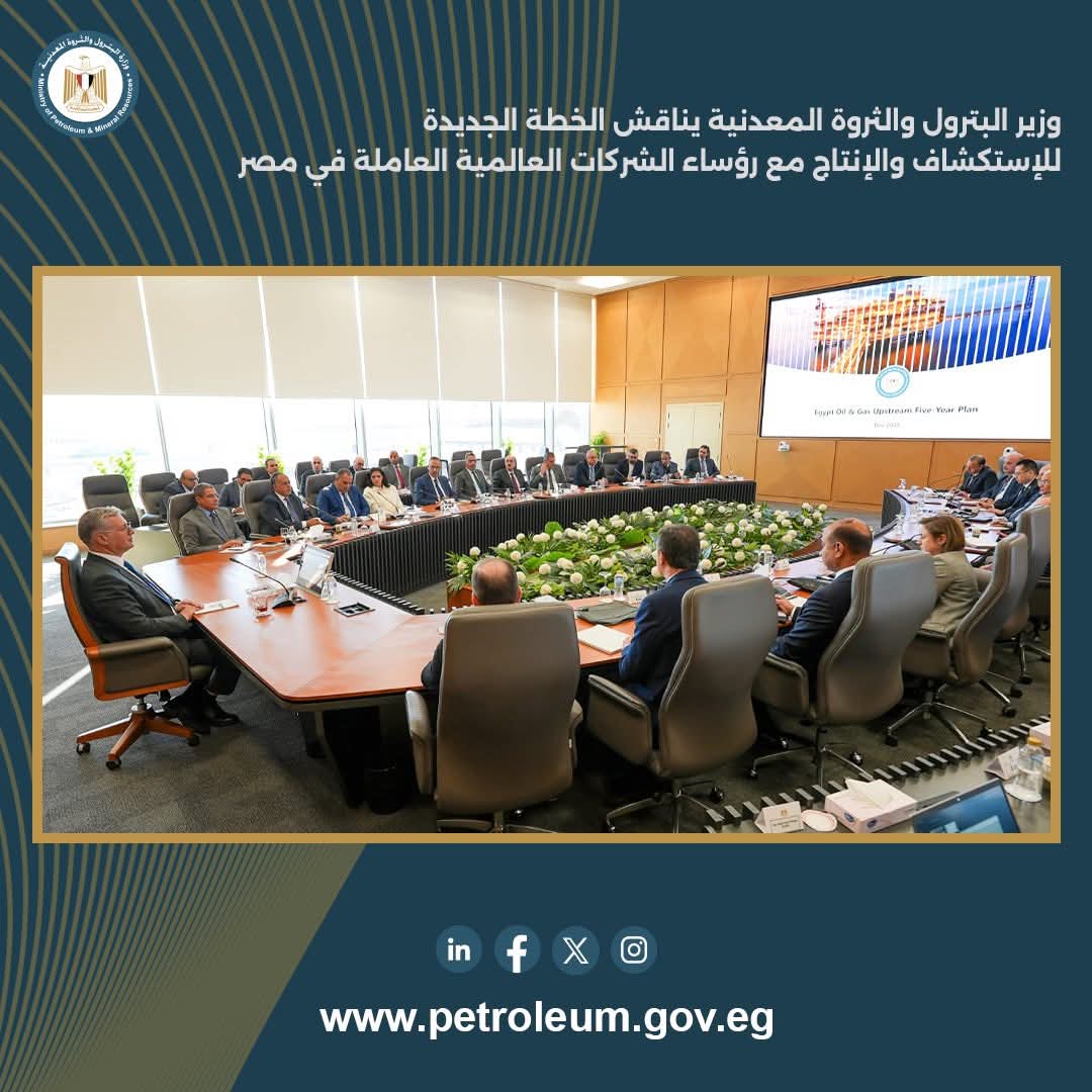 وخلال الاجتماع، تم استعراض أهداف الخمس سنوات لمجال البحث والاستكشاف في مصر، وإجراءات تحسين مناخ الاستثمار، والإنجازات المحققة في التغلب على التناقص الطبيعي في الإنتاج، واستقرار معدلات الإنتاج اليومية، إلى جانب بدء جهود زيادة الإنتاج، وتسليط الضوء على الأساليب الفنية المتبعة مع شركاء القطاع.