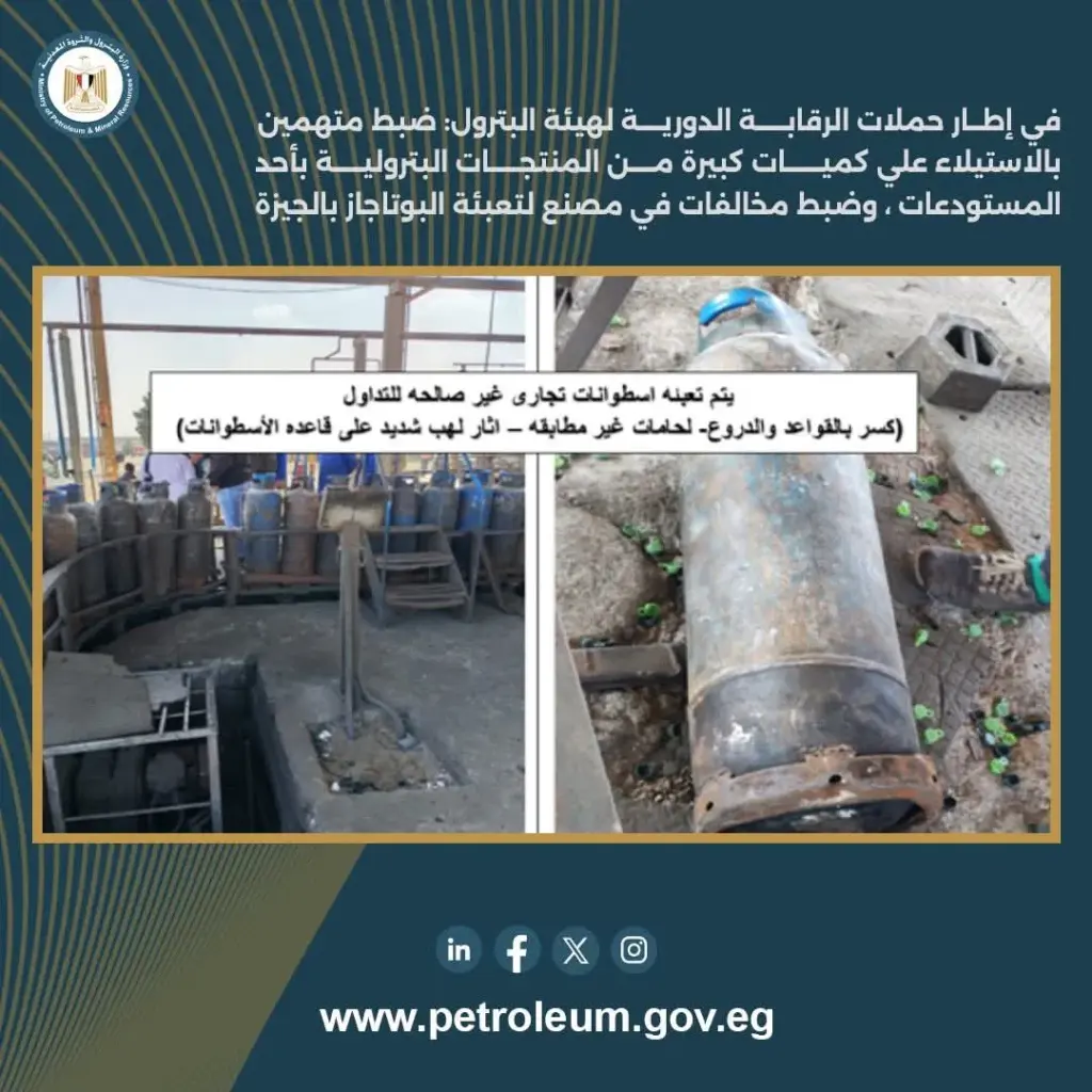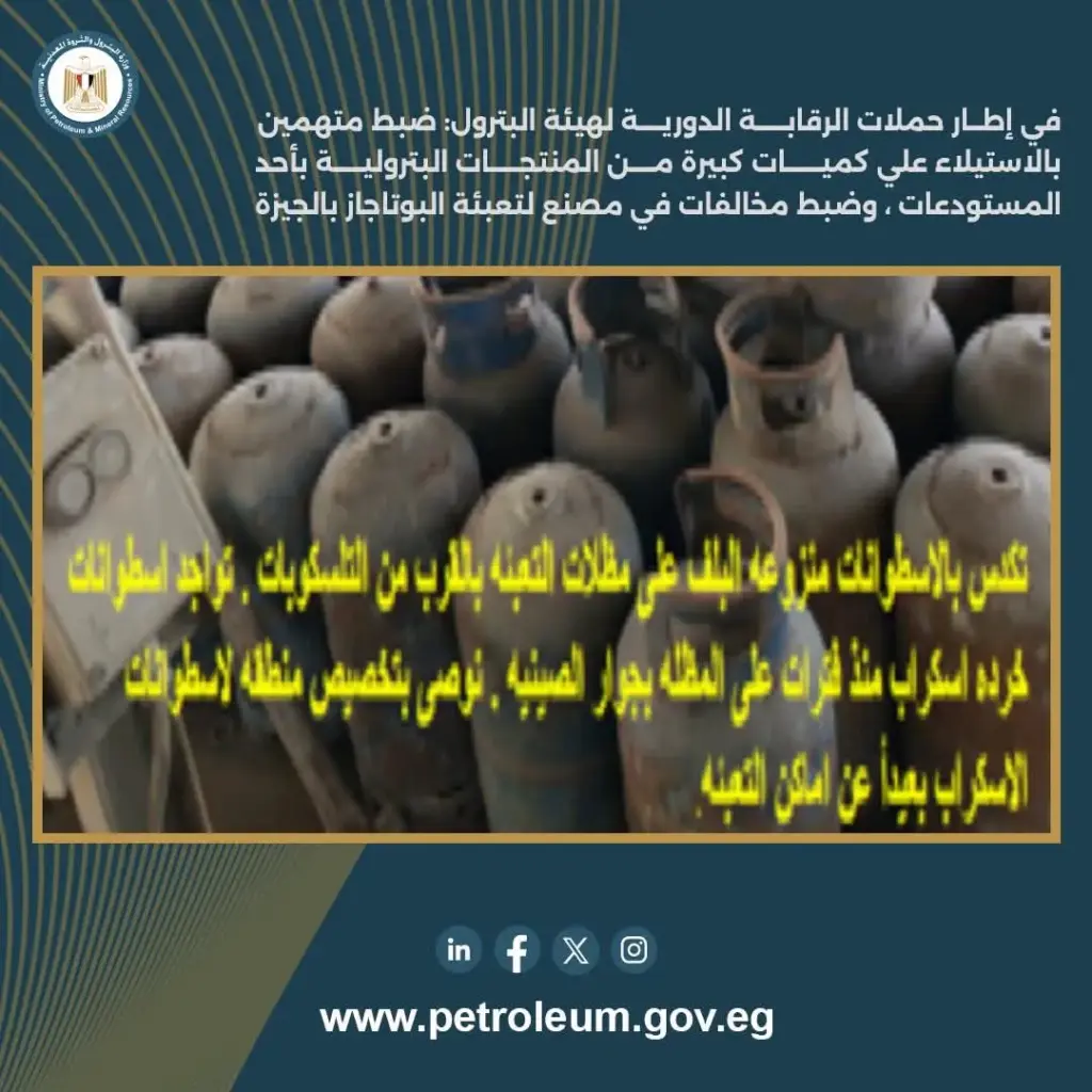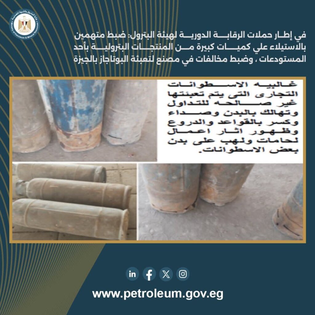 تم التفاعل مع الشكوى المقدمة ضد أحد مصانع تعبئة أسطوانات البوتاجاز بالجيزة وإجراء مراجعة شاملة على المصنع، وتبين وجود نقص في أوزان غالبية الأسطوانات المعدة للبيع للجمهور عن الأوزان الرسمية ، وقصور في إجراءات الفرز واستبعاد الأسطوانات التالفة غير الصالحة للتداول قبل التعبئة، والسماح لسيارات غير صالحة فنياً ومتهالكة بالدخول وتحميل الأسطوانات لتوزيعها على المخازن بما يمثل خطورة شديدة، كما تبين أن منظومة الإطفاء والإنذار بحاجة للصيانة، وتم اتخاذ الإجراءات اللازمة بالتنسيق مع الشركة المعنية بتشغيل المصنع، وتحرير محضر بالمخالفات.