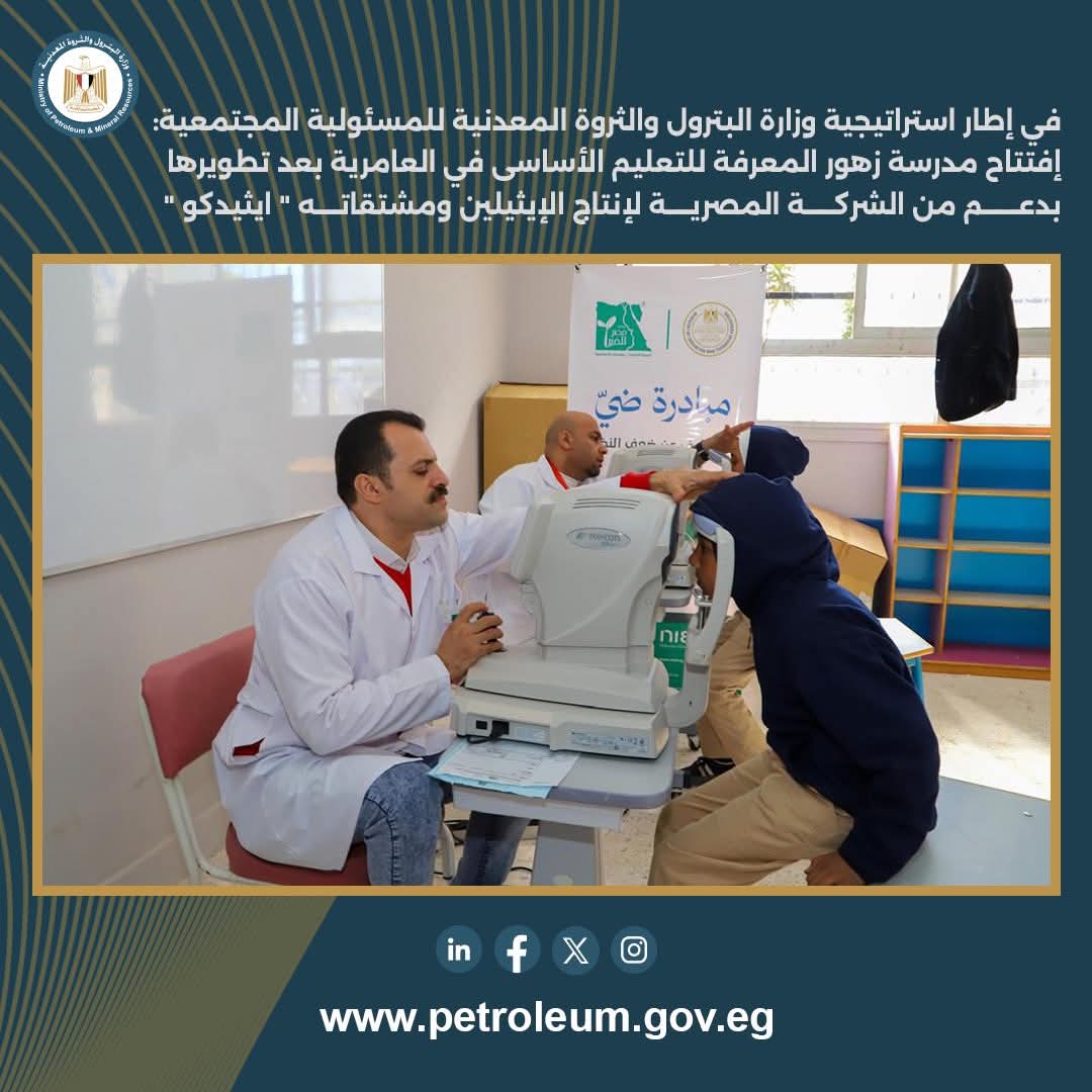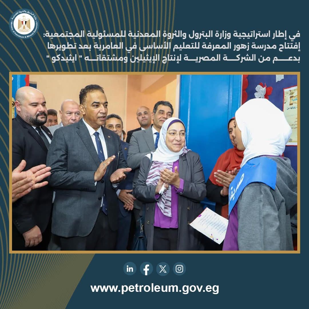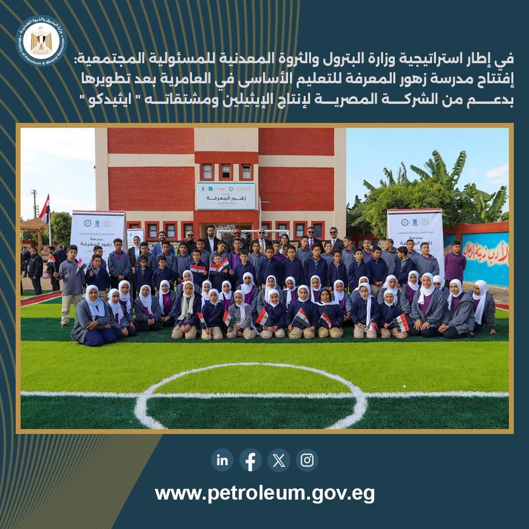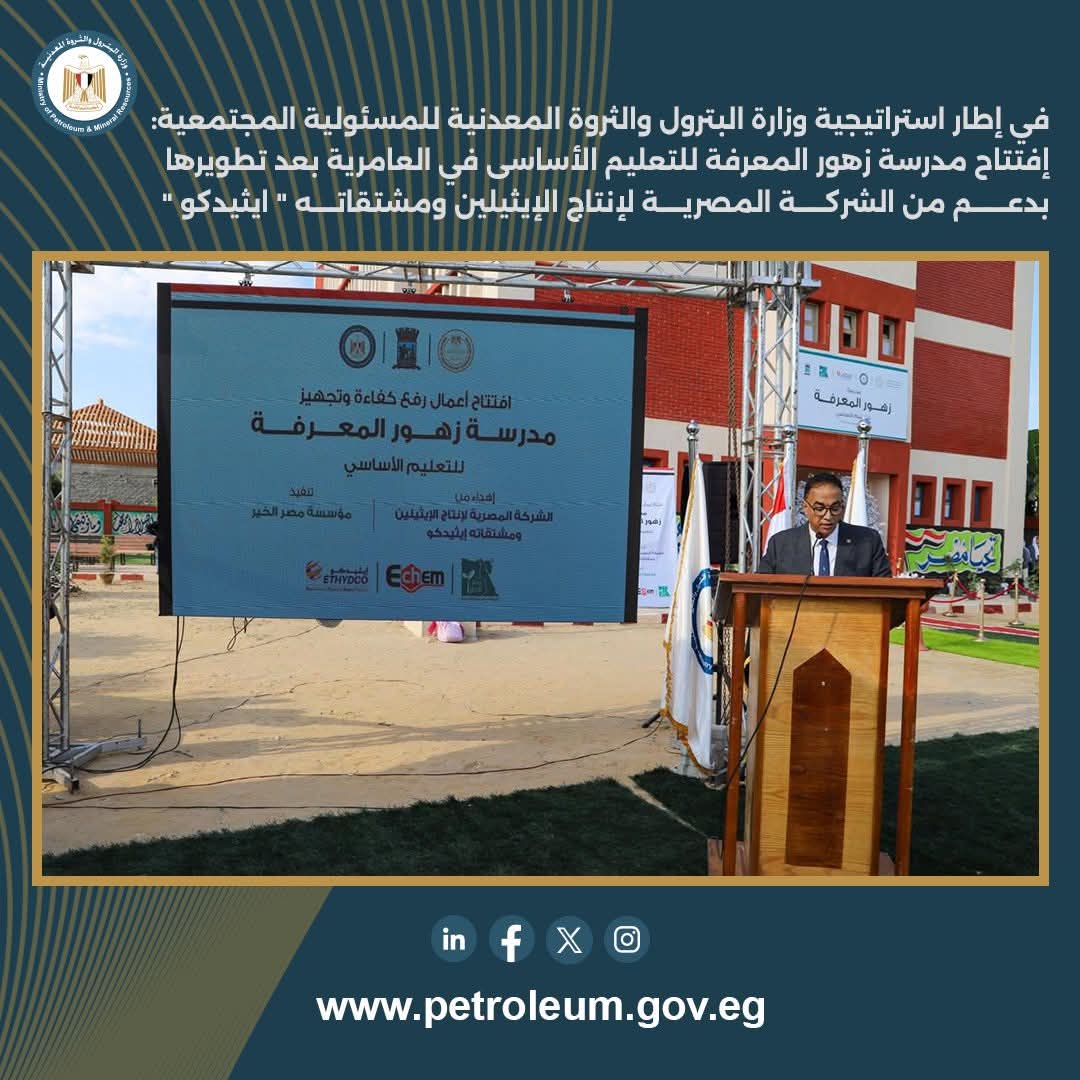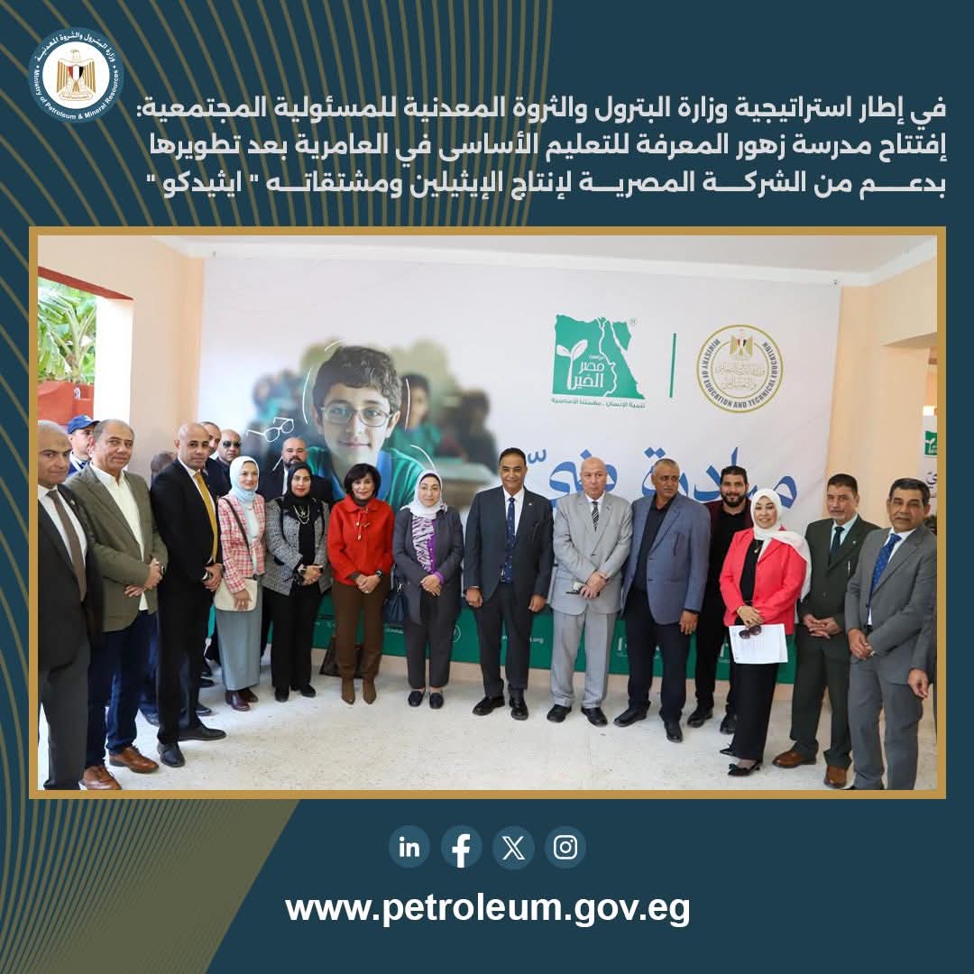 إنطلاقا من أهداف استراتيجية وزارة البترول والثروة المعدنية فى مجال المسئولية المجتمعية والتى يأتى التعليم فى مقدمتها ، تم افتتاح مشروع تطوير مدرسة زهور المعرفة للتعليم الأساسى بحى العامرية ” والذي دعمته الشركة المصرية لإنتاج الإيثيلين ومشتقاته بالأسكندرية ” إيثيدكو ” التزاما بدورها المجتمعي وبالتعاون مع مؤسسة مصر الخير للتنمية .