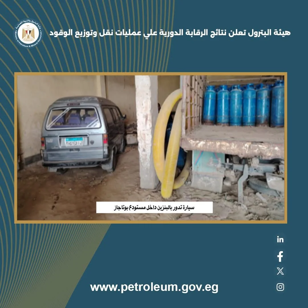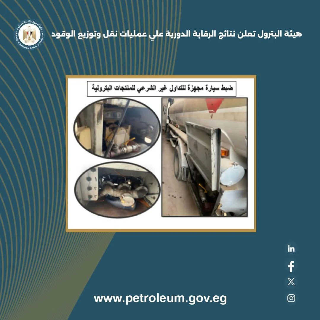 فيما تم ضبط سائق سيارة صهريجية تابعة لأحد مقاولي النقل أثناء سرقة كمية من المنتج البترولي حيازته والموجه لإحدى محطات الوقود وتم تحرير محضر وتغريم المقاول وحظر السائق نهائياً ،وفي الجيزة تم ضبط سيارة صهريجية 8000 لتر تابعة لمحطة ومجهزة بموتور تفريغ للتداول غير الشرعي .