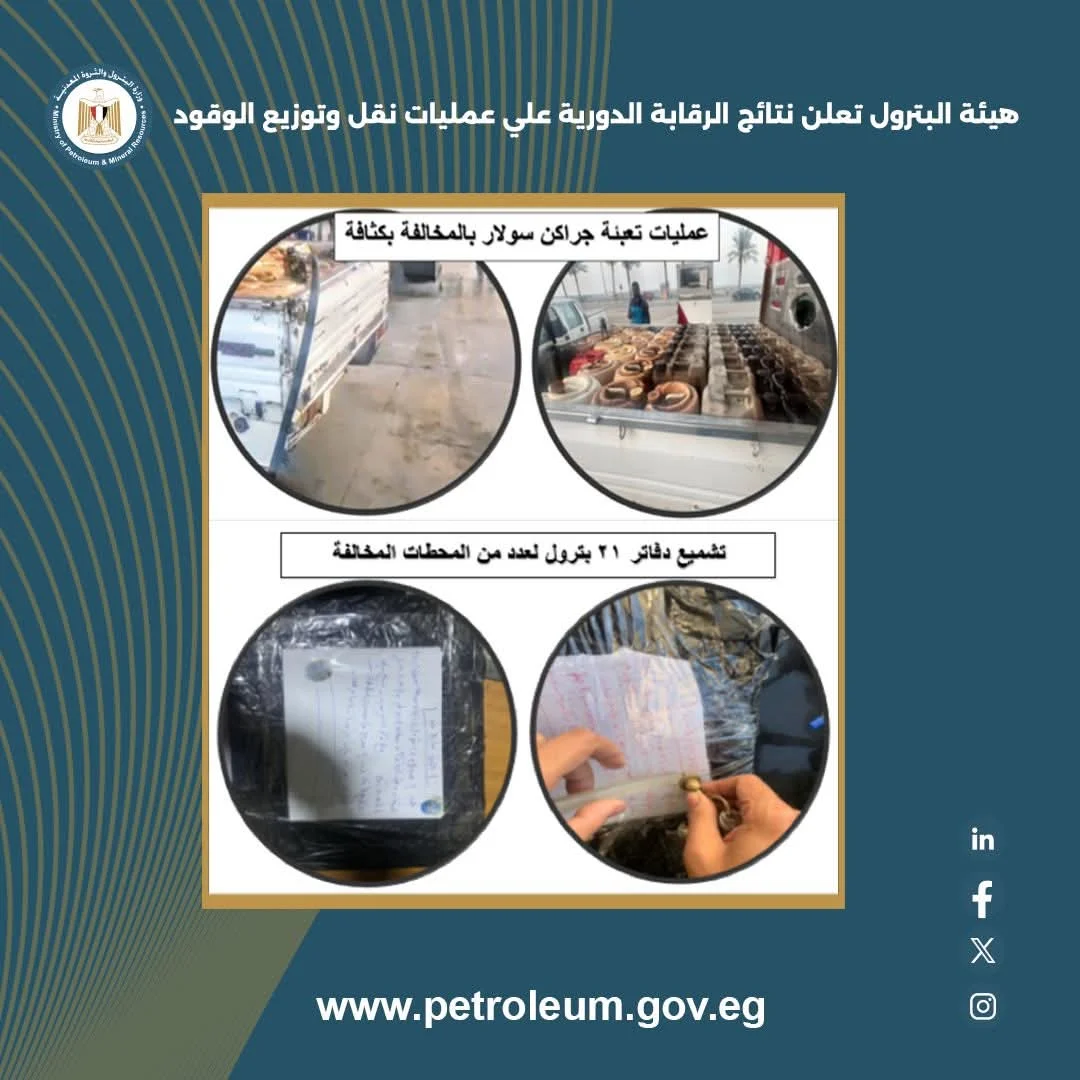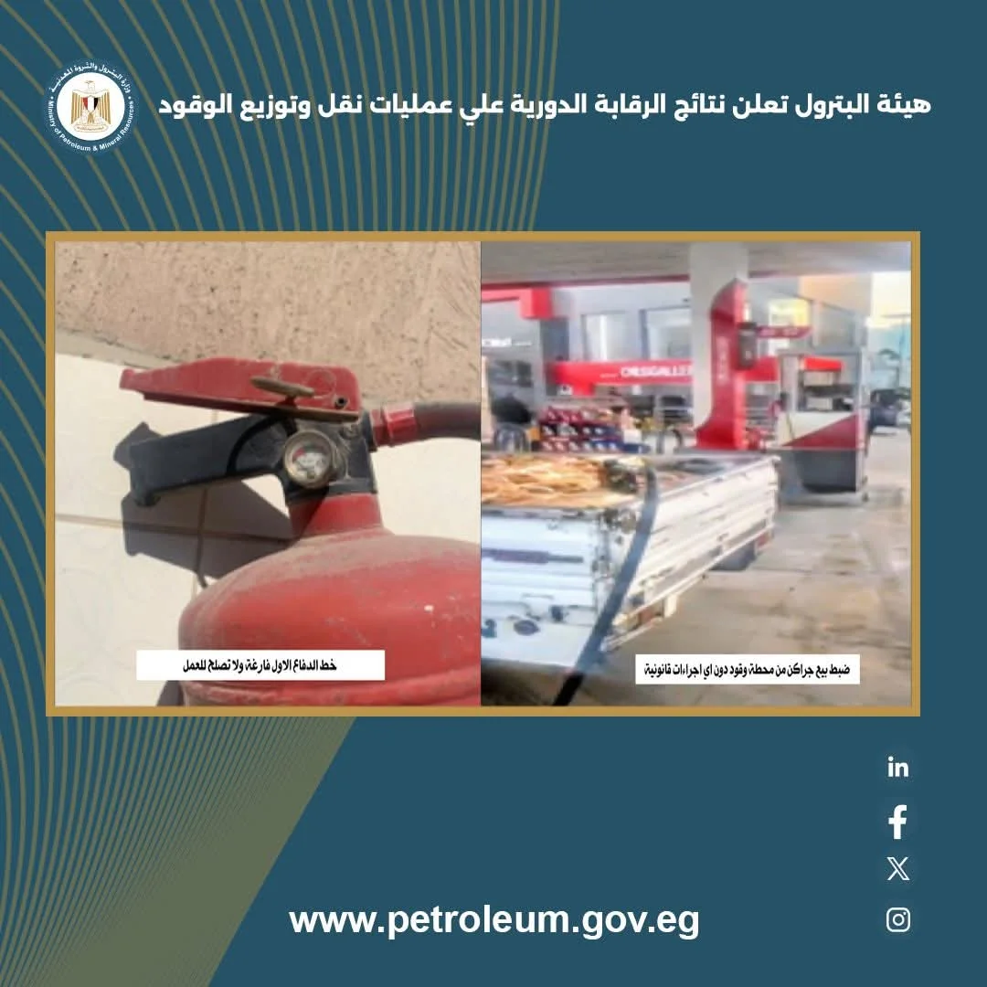 كما تم إجراء مراجعات لنحو 26 محطة وقود بمحافظات (القاهرة- الجيزة -السويس-البحيرة-دمياط-الفيوم) تابعة لسبع شركات تسويق ، وتم رصد انحراف بعيار عدد من مسدسات التموين ببعض المحطات ، ووجود مياه في بعض صهاريج المنتجات وتم التطهير الفوري ، وعمليات تعبئة سولار بالجراكن على سيارات نصف نقل ، و قيام احد المحطات بالجيزة بعمل بيارة صرف مكشوفة أسفل منزل مجاور مما يعرضه لخطر داهم ، وتم الزام الشركة التابع لها المحطة بسرعة تعديل شبكة الصرف وإلغاء البيارة .