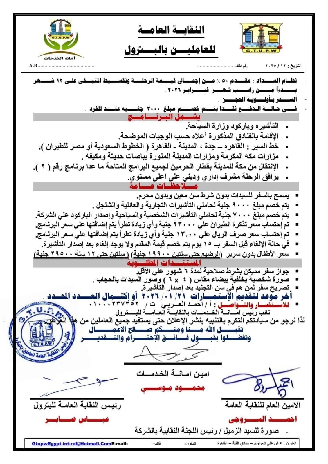 وأضافت أن نظام السداد يتضمن سداد مقدم حجز بنسبة 50% من إجمالي قيمة الرحلة، مع تقسيط باقي المبلغ على 12 شهرًا، يبدأ الخصم اعتبارًا من راتب شهر فبراير 2026، مع منح خصم قدره 3000 جنيه للفرد في حالة السداد النقدي.