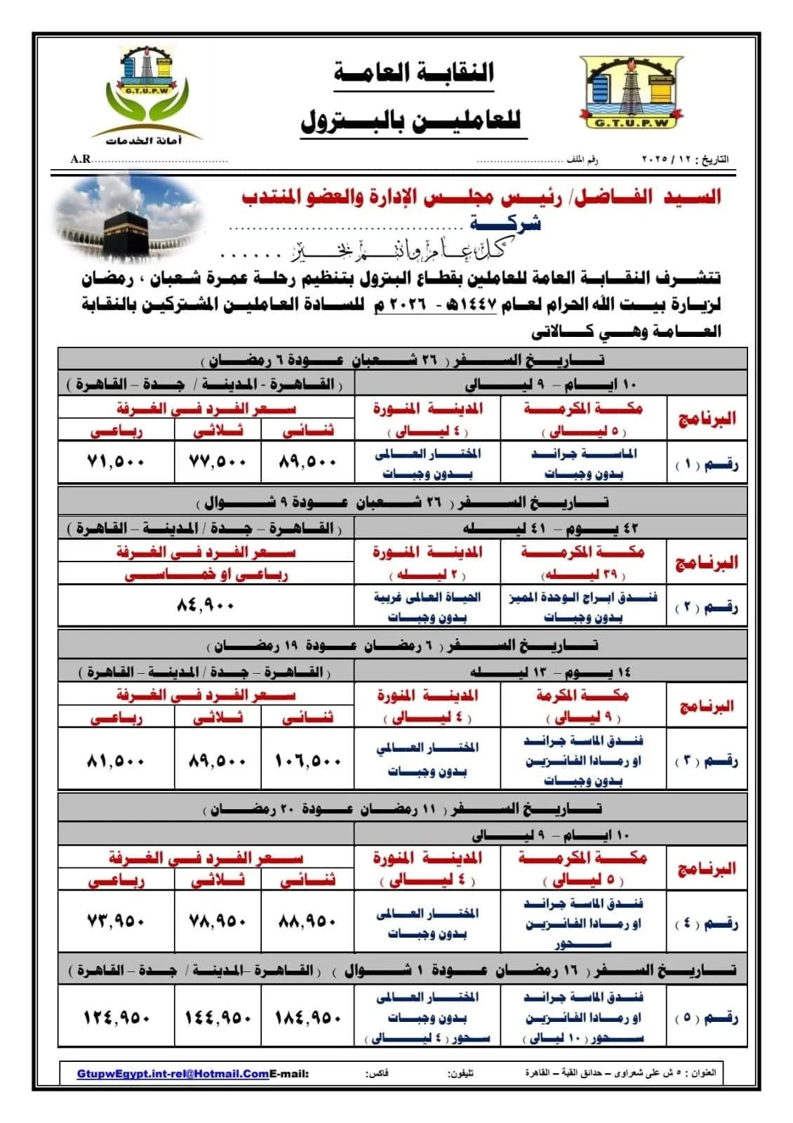 أعلنت النقابة العامة للعاملين بالبترول، برئاسة المحاسب عباس صابر، عن فتح باب التقدم لبرامج عمرة شعبان ورمضان لعام 1447هـ – 2026م للعاملين بقطاع البترول وأسرهم، وذلك في إطار الدور الاجتماعي للنقابة وحرصها على تخفيف الأعباء عن العاملين، وإتاحة الفرصة لأداء مناسك العمرة في أجواء منظمة وآمنة.