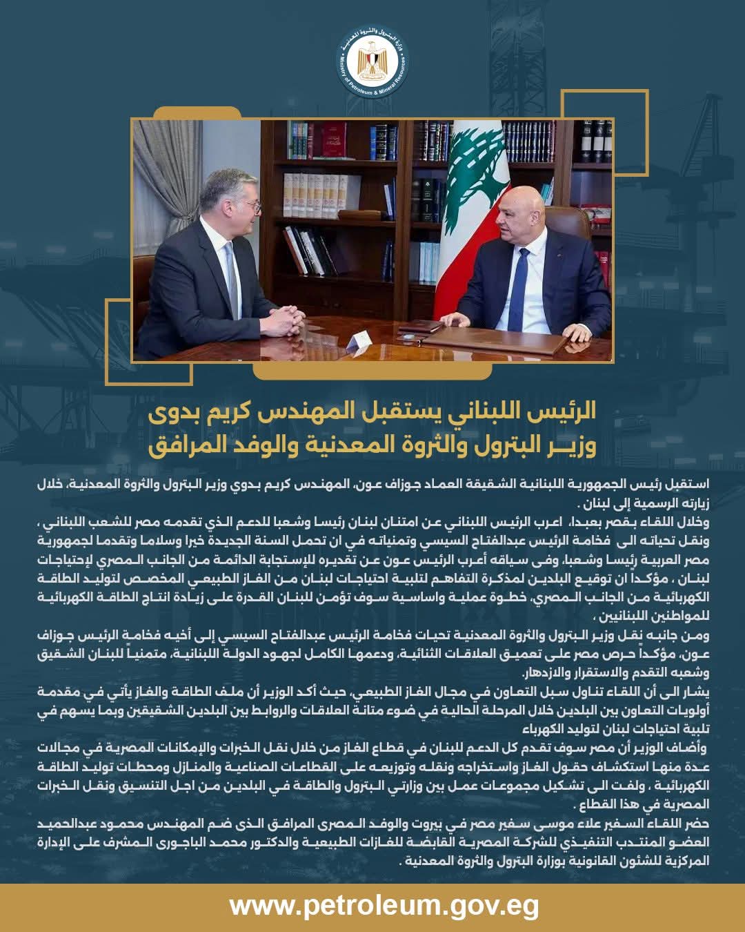 ومن جانبه، نقل وزير البترول والثروة المعدنية تحيات الرئيس عبد الفتاح السيسي إلى أخيه فخامة الرئيس جوزاف عون، مؤكدًا حرص مصر على تعميق العلاقات الثنائية، ودعمها الكامل لجهود الدولة اللبنانية، ومتمنيًا للبنان الشقيق وشعبه التقدم والاستقرار والازدهار.