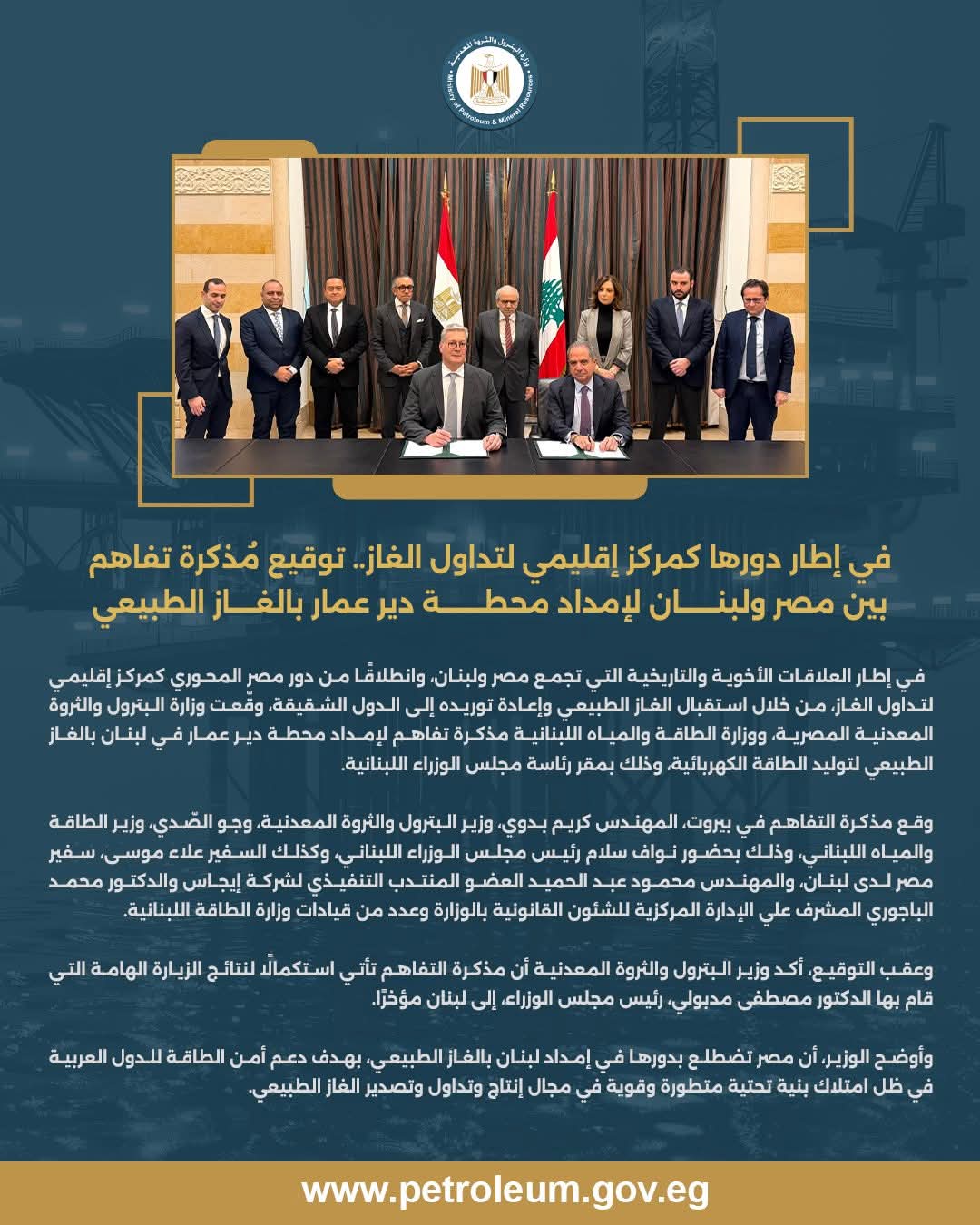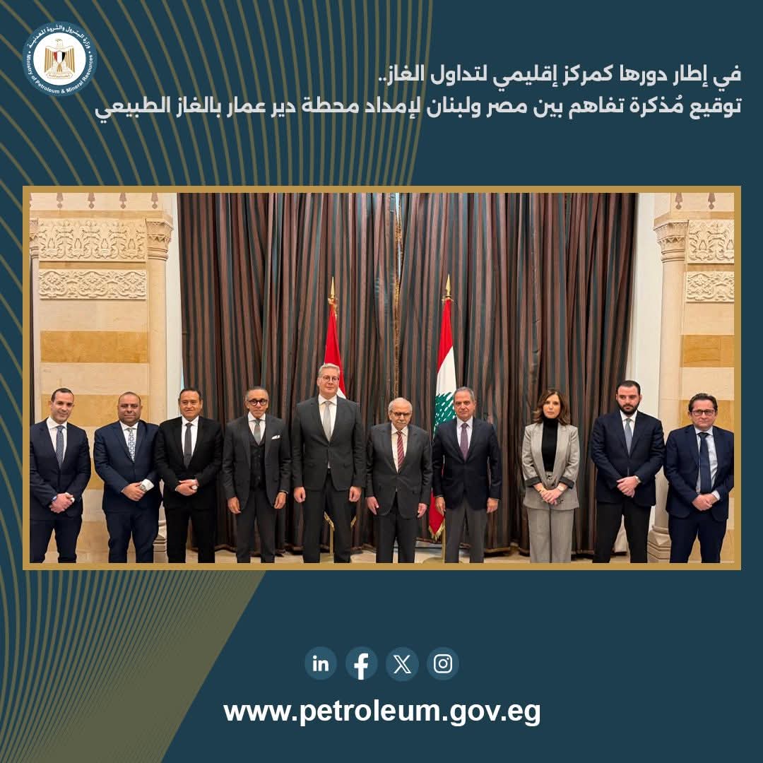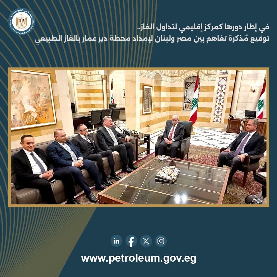 في إطار العلاقات الأخوية والتاريخية التي تجمع مصر ولبنان، وانطلاقًا من دور مصر المحوري كمركز إقليمي لتداول الغاز، من خلال استقبال الغاز الطبيعي وإعادة توريده إلى الدول الشقيقة، وقّعت وزارة البترول والثروة المعدنية المصرية ووزارة الطاقة والمياه اللبنانية مذكرة تفاهم لإمداد محطة دير عمار في لبنان بالغاز الطبيعي لتوليد الطاقة الكهربائية، وذلك بمقر رئاسة مجلس الوزراء اللبنانية.