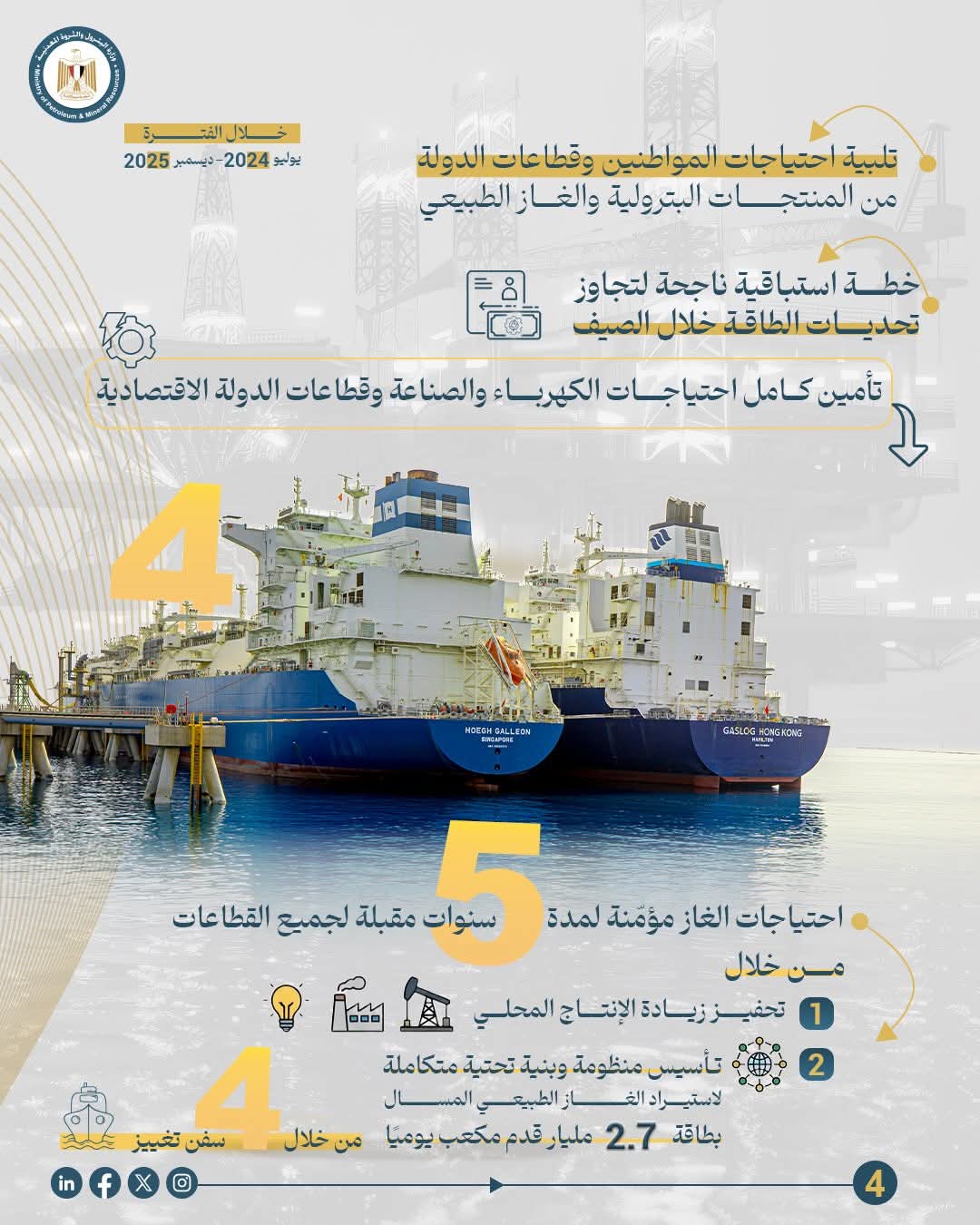 • تنفيذ خطة استباقية، بدعم من فخامة الرئيس عبد الفتاح السيسي ودولة رئيس مجلس الوزراء الدكتور مصطفى مدبولي، لتجاوز تحديات الطاقة وتأمين الإمدادات اللازمة لمحطات الكهرباء خلال فصل الصيف، وتوفير كامل احتياجات قطاع الصناعة وكافة قطاعات الدولة الاقتصادية من الغاز، والتي أصبحت مؤمَّنة لمدة خمس سنوات مقبلة. وبالإضافة إلى جهود زيادة الإنتاج المحلي، تم تأسيس منظومة وبنية تحتية متكاملة لاستيراد الغاز الطبيعي المسال عبر سفن التغييز، بطاقة تصل إلى 2.7 مليار قدم مكعب يوميًا، وبجهود أكثر من 1500 زميل وزميلة من قطاع البترول.