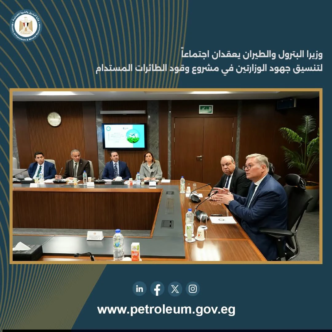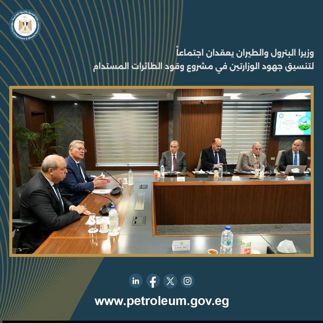 عقد المهندس كريم بدوي، وزير البترول والثروة المعدنية، والدكتور سامح الحفني، وزير الطيران المدني، اجتماعًا بمقر وزارة البترول والثروة المعدنية بالعاصمة الإدارية الجديدة، بحضور فريق عمل الوزارتين، للتنسيق بشأن مشروع إنتاج وقود الطائرات المستدام (SAF)، الجاري تنفيذه كأحد مشروعات وزارة البترول من خلال الشركة المصرية القابضة للبتروكيماويات.