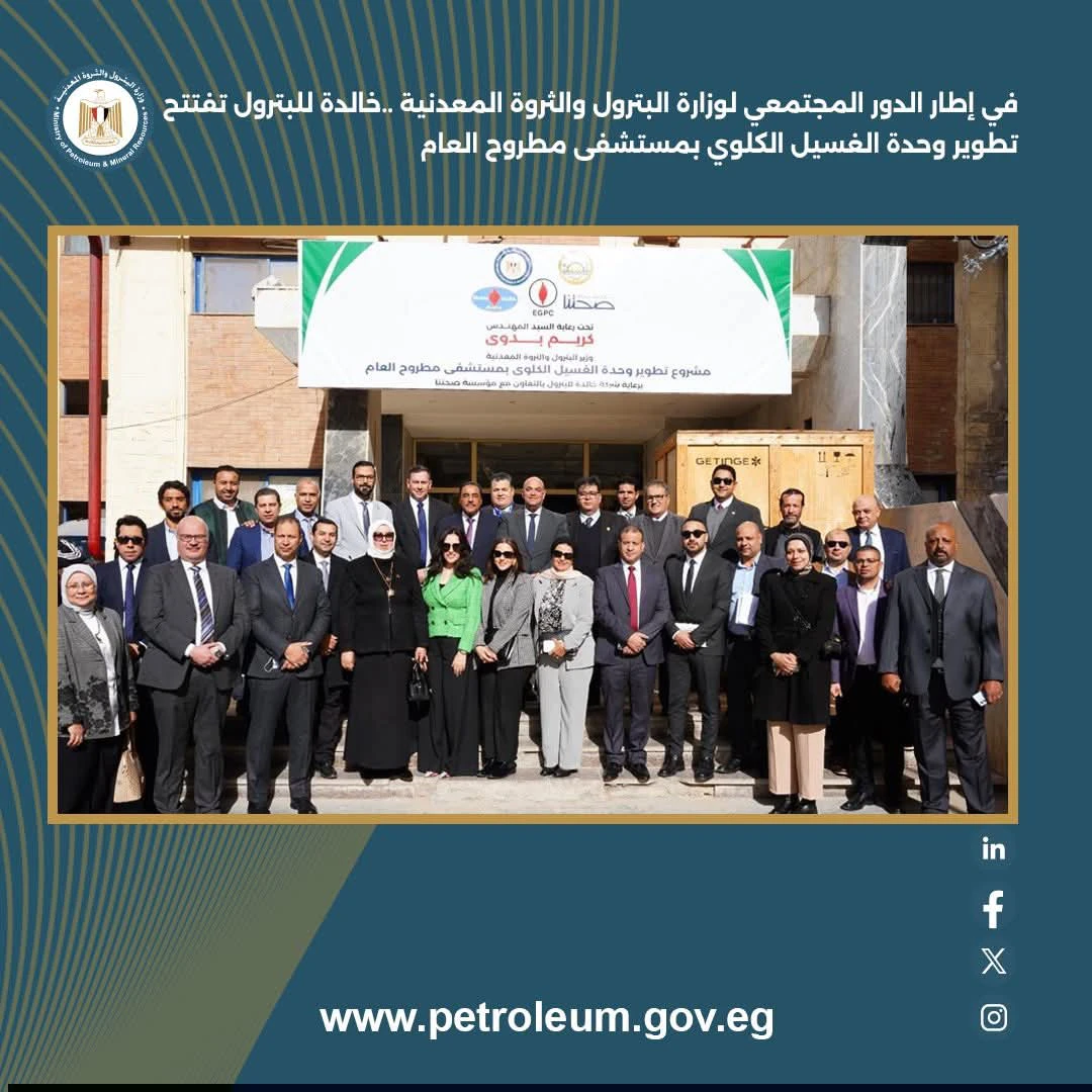 ويأتي ذلك تنفيذًا لاستراتيجية وزارة البترول والثروة المعدنية في مجال المسؤولية المجتمعية، حيث تم توفير الأجهزة الثمانية من شركة خالدة للبترول لوحدة الغسيل الكلوي بالمستشفى، وتطوير الوحدة بالتعاون مع مؤسسة صحتنا.