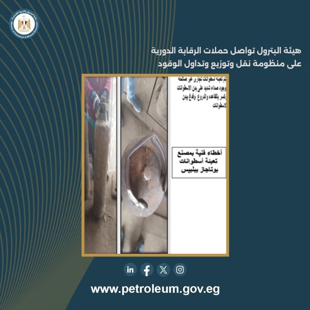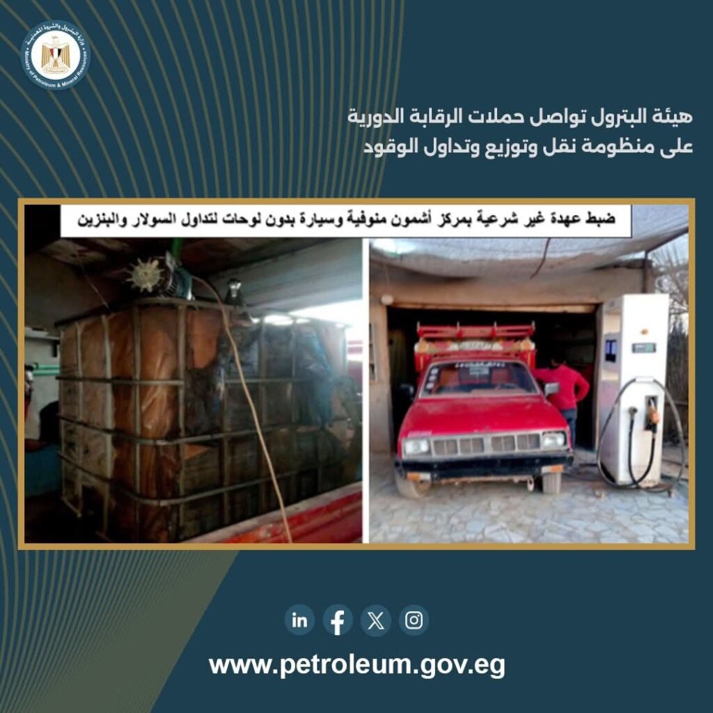 • تم المرور والمراجعة على (23) محطة وقود بمحافظات: البحيرة، الشرقية، المنوفية، الإسكندرية، دمياط، وتم رصد عدد من المخالفات .
