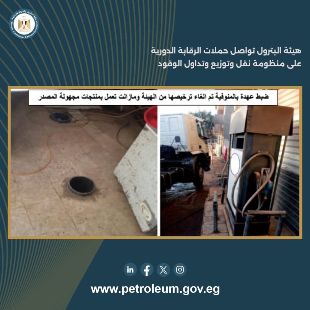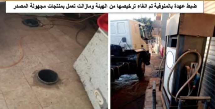 وفي إطار استمرار جهود مكافحة ظاهرة نقاط التموين غير المرخصة، تمكنت اللجنة خلال المرور الميداني من ضبط نقطة غير شرعية بمركز أشمون بمحافظة المنوفية، كما تم ضبط محطة بمحافظة المنوفية سبق إلغاء ترخيصها من الهيئة، ومع ذلك استأنف صاحبها التشغيل بمنتجات مجهولة المصدر بالمخالفة للقانون، وتم إخطار الجهات المعنية لسرعة الإزالة .