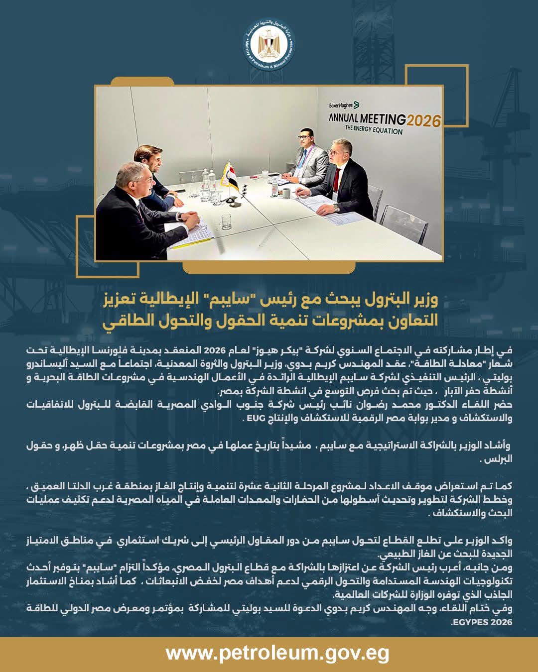 عقد المهندس كريم بدوي، وزير البترول والثروة المعدنية، اجتماعًا مع السيد أليساندرو بوليتي، الرئيس التنفيذي لشركة «سايبم» الإيطالية، الرائدة في الأعمال الهندسية لمشروعات الطاقة البحرية وأنشطة حفر الآبار، حيث جرى بحث فرص التوسع في أنشطة الشركة بمصر، وذلك في إطار مشاركته في الاجتماع السنوي لشركة «بيكر هيوز» لعام 2026، والمنعقد بمدينة فلورنسا الإيطالية تحت شعار «معادلة الطاقة».