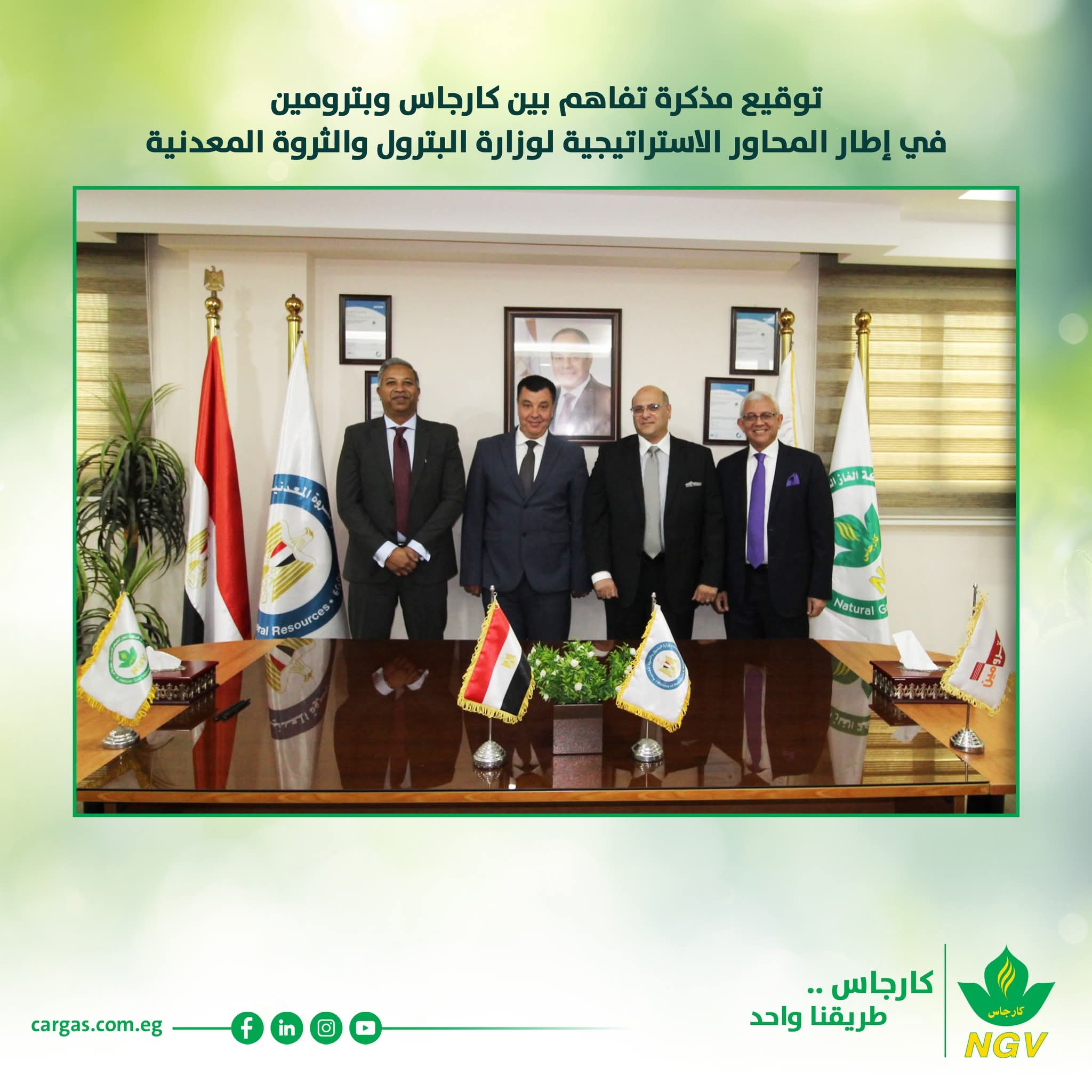 في إطار تنفيذ المحاور الاستراتيجية لوزارة البترول والثروة المعدنية، وقّعت شركتا كارجاس وبترومين مذكرة تفاهم للتعاون المشترك، دعمًا لتوجهات الدولة لتعظيم الاستفادة من موارد الطاقة وتهيئة بيئة استثمارية جاذبة وتعزيز التكامل بين شركات قطاع البترول.