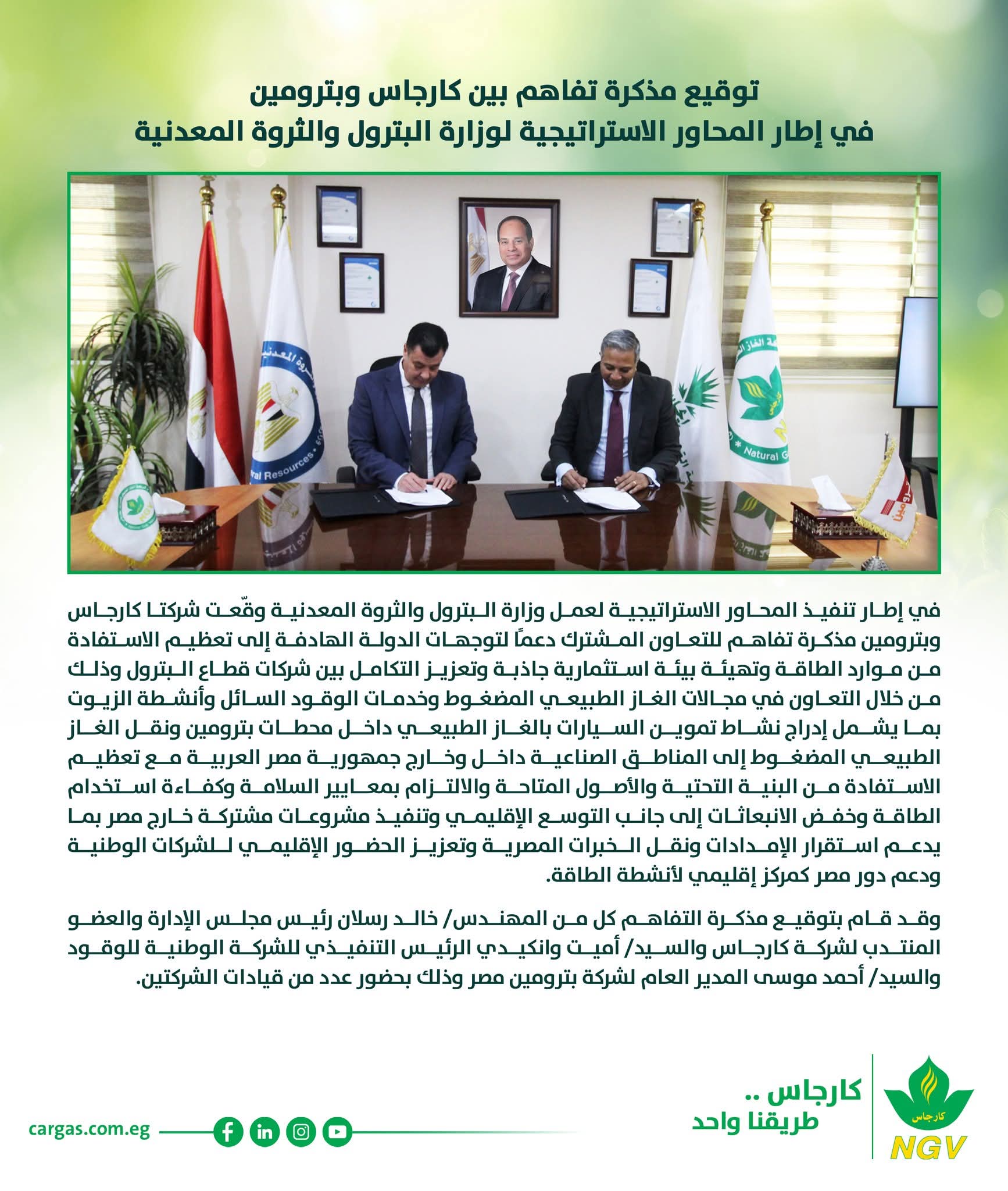 وقد وقع مذكرة التفاهم كل من المهندس خالد رسلان رئيس مجلس الإدارة والعضو المنتدب لشركة كارجاس، والسيد أميت وانكيدي الرئيس التنفيذي للشركة الوطنية للوقود، والسيد أحمد موسى المدير العام لشركة بترومين مصر، بحضور عدد من قيادات الشركتين.