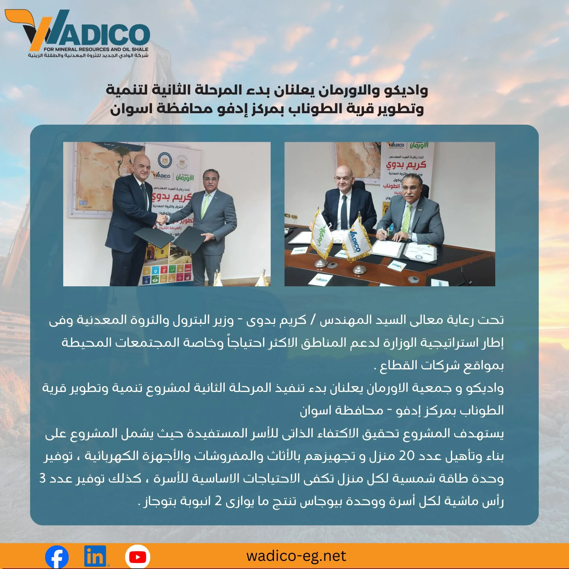 أعلنت شركة الوادي الجديد للثروة المعدنية والطفلة الزيتية – واديكو بالتعاون مع جمعية الأورمان عن بدء المرحلة الثانية لمشروع تنمية وتطوير قرية الطوناب بمركز إدفو بمحافظة أسوان، وذلك تحت رعاية المهندس كريم بدوي وزير البترول والثروة المعدنية، وفي إطار استراتيجية الوزارة لدعم المناطق الأكثر احتياجًا والمجتمعات المحيطة بمواقع شركات القطاع.