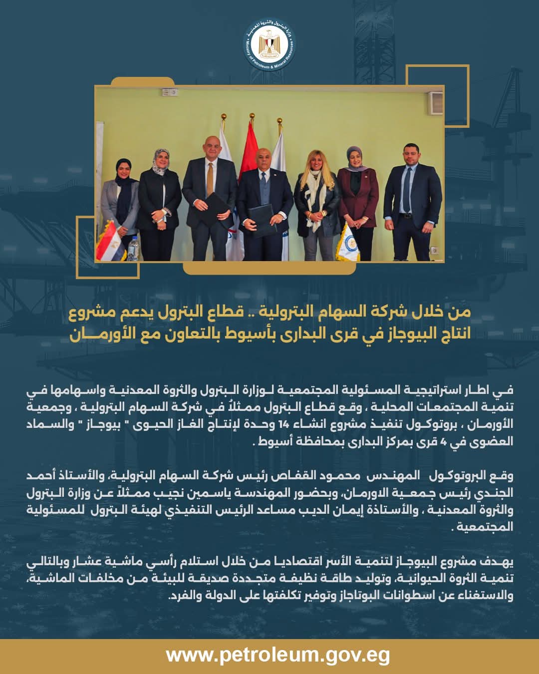 وقّع قطاع البترول ممثلًا في شركة السهام البترولية، وجمعية الأورمان، بروتوكول تنفيذ مشروع إنشاء 14 وحدة لإنتاج الغاز الحيوي (بيوجاز) والسماد العضوي في أربع قرى بمركز البداري بمحافظة أسيوط.