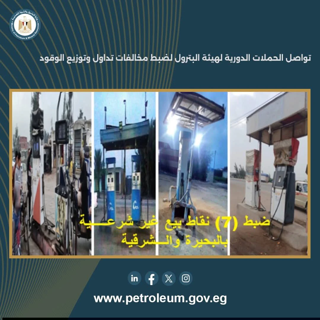 ونجحت جهود مكافحة نقاط البيع غير الشرعية في ضبط 7 نقاط بيع بمحافظتي البحيرة والشرقية تتداول منتجات بترولية مجهولة المصدر وبدون اشتراطات أمان وتم تحرير محاضر ضدها.