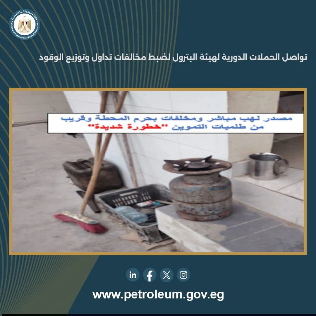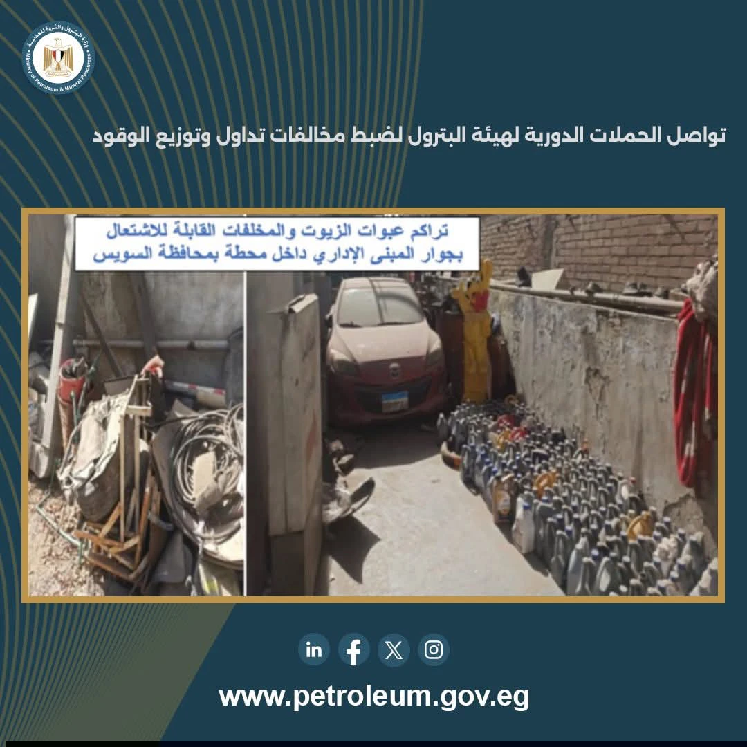 واصلت اللجنة المركزية للرقابة على نقل وتداول المنتجات البترولية بـ “الهيئة المصرية العامة للبترول”  ، خلال الأسبوع الأول من فبراير الجارى حملاتها المكثفة والتي اسفرت عن ضبط عدد من المخالفات في نقل وتداول المنتجات البترولية واتخاذ الاجراءات القانونية تجاهها على الفور.
