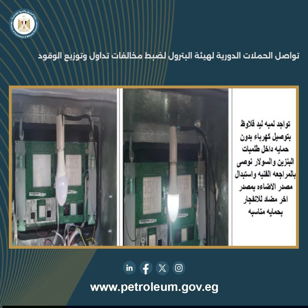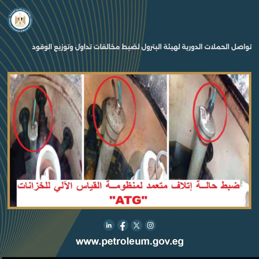 كما شملت أعمال التفتيش المرور على 34 محطة وقود في القاهرة والإسكندرية والبحيرة والسويس والدقهلية والشرقية ورصد قيام متعهد إحدى المحطات بالشرقية إتلاف منظومة القياس الآلي للخزانات ATG التي تمثل أحد الأدوات الرقابية الالكترونية لهيئة البترول إلى جانب ملاحظات تمس سلامة المواطنين والممتلكات ، وأكدت الهيئة أنها نبهت شركات التسويق بسرعة تلافي جميع المخالفات والإفادة بما تم.