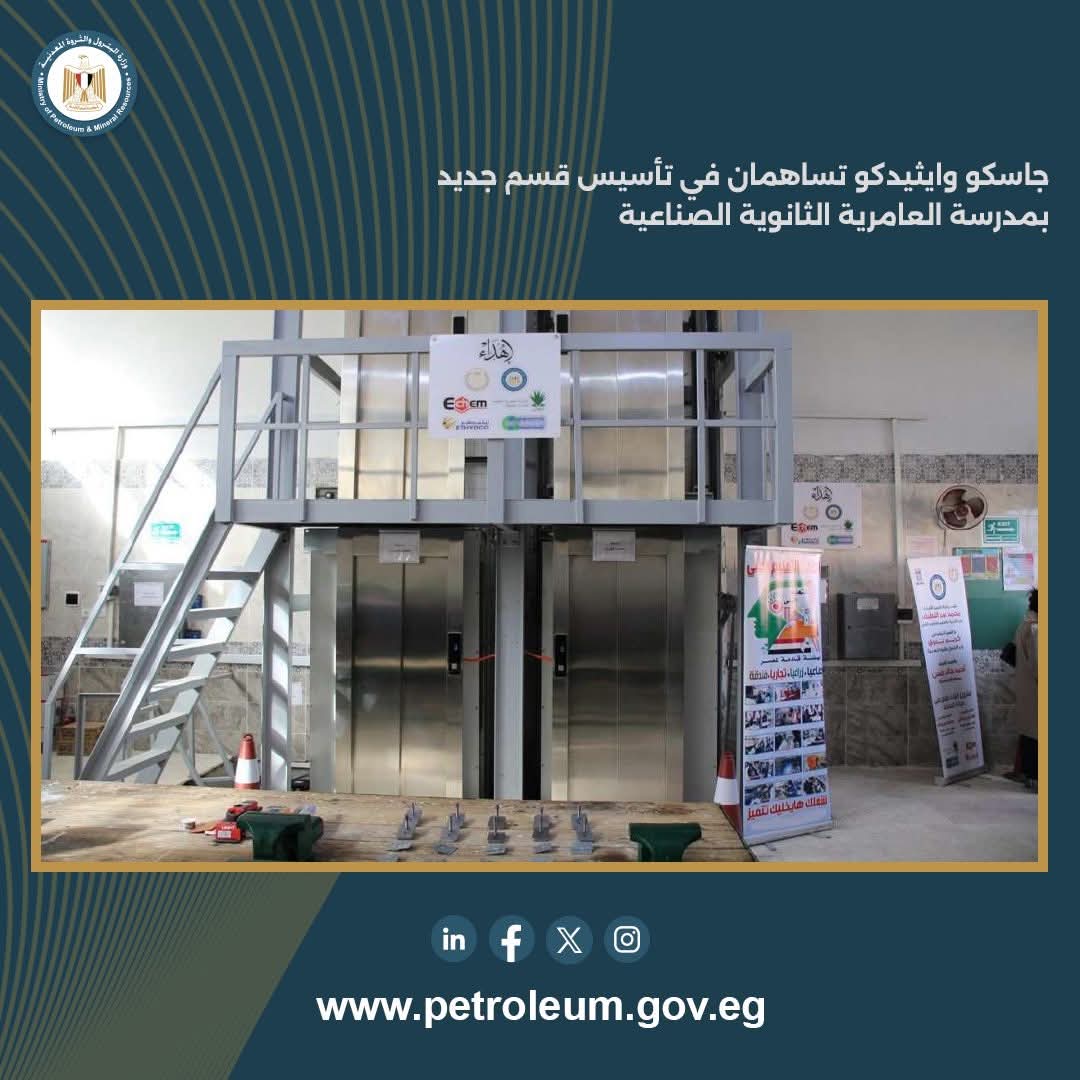 تنفيذاً لأهداف استراتيجية وزارة البترول والثروة المعدنية للمسؤولية المجتمعية، والتي تضع دعم منظومة التعليم المصري من أهم أولوياتها، قامت الشركة المصرية للغازات الطبيعية (جاسكو) والشركة المصرية لإنتاج الإيثيلين ومشتقاته (إيثيدكو) بتقديم الدعم والمساهمة في إنشاء قسم فني جديد بمدرسة العامرية الثانوية الصناعية بالإسكندرية لصيانة المصاعد.