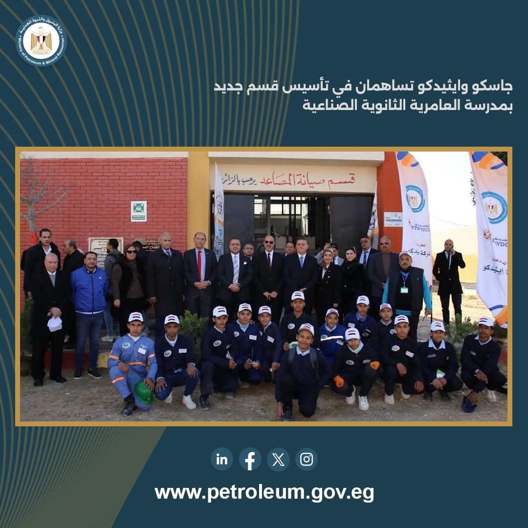 تنفيذاً لأهداف استراتيجية وزارة البترول والثروة المعدنية للمسؤولية المجتمعية، والتي تضع دعم منظومة التعليم المصري من أهم أولوياتها، قامت الشركة المصرية للغازات الطبيعية (جاسكو) والشركة المصرية لإنتاج الإيثيلين ومشتقاته (إيثيدكو) بتقديم الدعم والمساهمة في إنشاء قسم فني جديد بمدرسة العامرية الثانوية الصناعية بالإسكندرية لصيانة المصاعد.