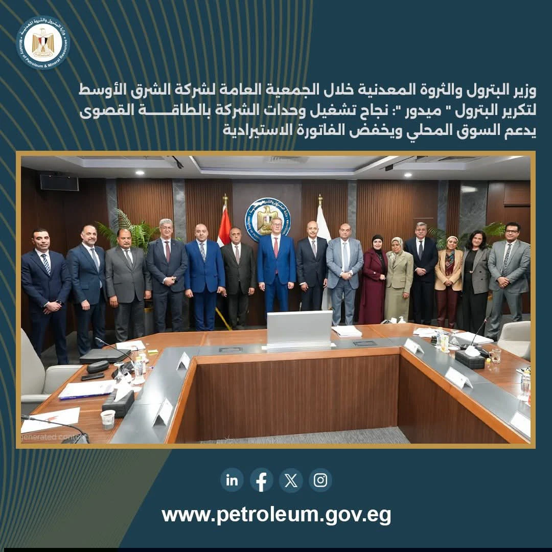 وأوضح الوزير، خلال اجتماع الجمعية العامة لاعتماد نتائج أعمال الشركة لعام 2025، أن وصول «ميدور» إلى التشغيل بالطاقة الإنتاجية القصوى يمثل نقلة نوعية وقيمة مضافة كبيرة لقطاع البترول المصري، لما يتيحه ذلك من زيادة المعروض من كميات المنتجات البترولية عالية الجودة بالسوق المحلي، وتقليل الاعتماد على الاستيراد بما يسهم في خفض الفاتورة الاستيرادية.