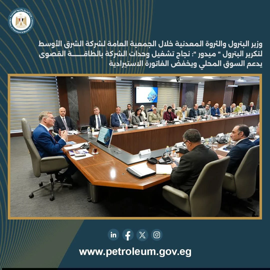 وأوضح الوزير، خلال اجتماع الجمعية العامة لاعتماد نتائج أعمال الشركة لعام 2025، أن وصول «ميدور» إلى التشغيل بالطاقة الإنتاجية القصوى يمثل نقلة نوعية وقيمة مضافة كبيرة لقطاع البترول المصري، لما يتيحه ذلك من زيادة المعروض من كميات المنتجات البترولية عالية الجودة بالسوق المحلي، وتقليل الاعتماد على الاستيراد بما يسهم في خفض الفاتورة الاستيرادية.