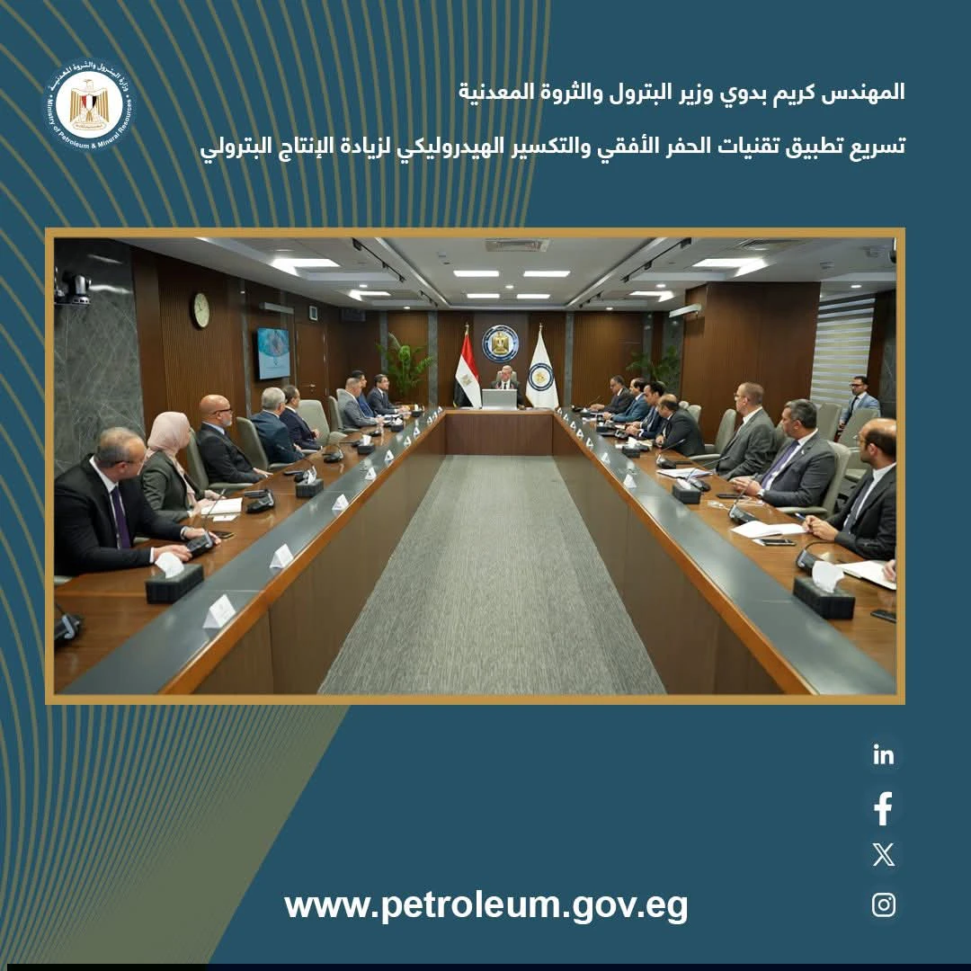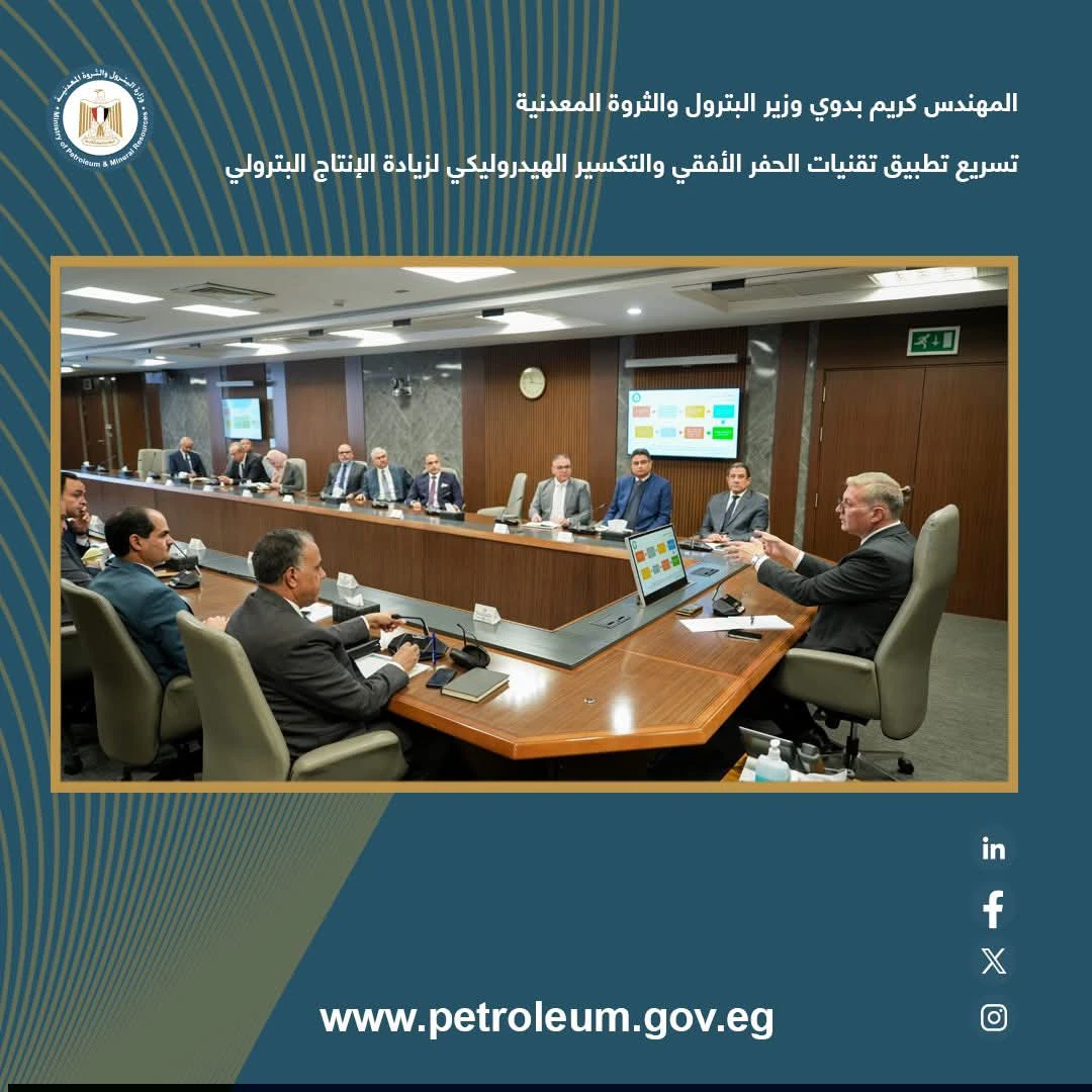 وخلال الاجتماع، الذي حضره قيادات الوزارة ومديرو كبرى شركات الخدمات والتكنولوجيا العالمية العاملة في مصر، استعرض الرئيس التنفيذي للهيئة المصرية العامة للبترول، الفرص الواعدة لتطبيق تقنيات الحفر الأفقي والحفر الجانبي في عدد من الخزانات التقليدية بالمناطق البترولية، في مقدمتها الصحراء الغربية، إلى جانب الصحراء الشرقية وخليج السويس وسيناء.